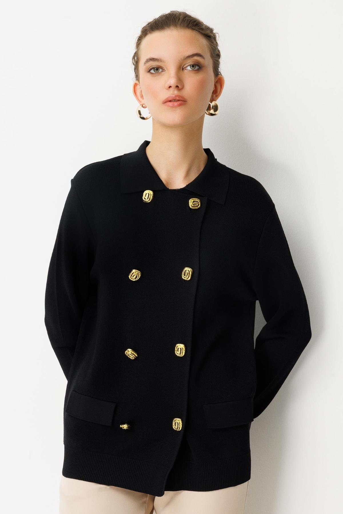 Gömlek yaka, cep kapaklı, çift sıra gold düğmeli triko kısa hırka-