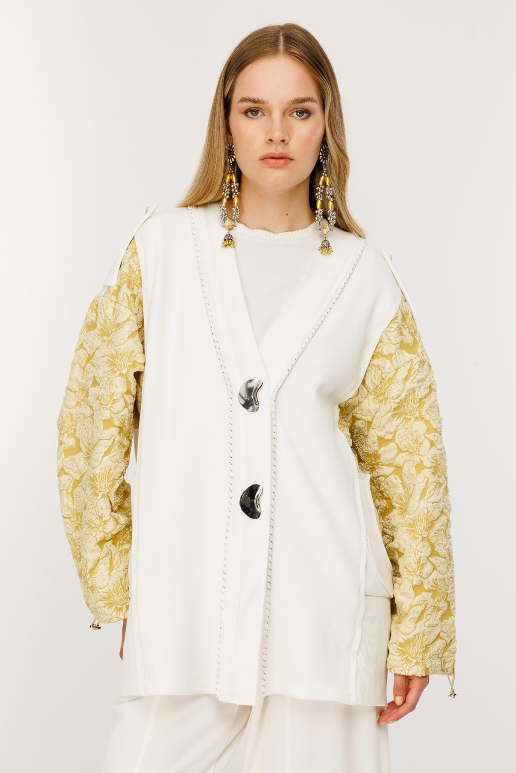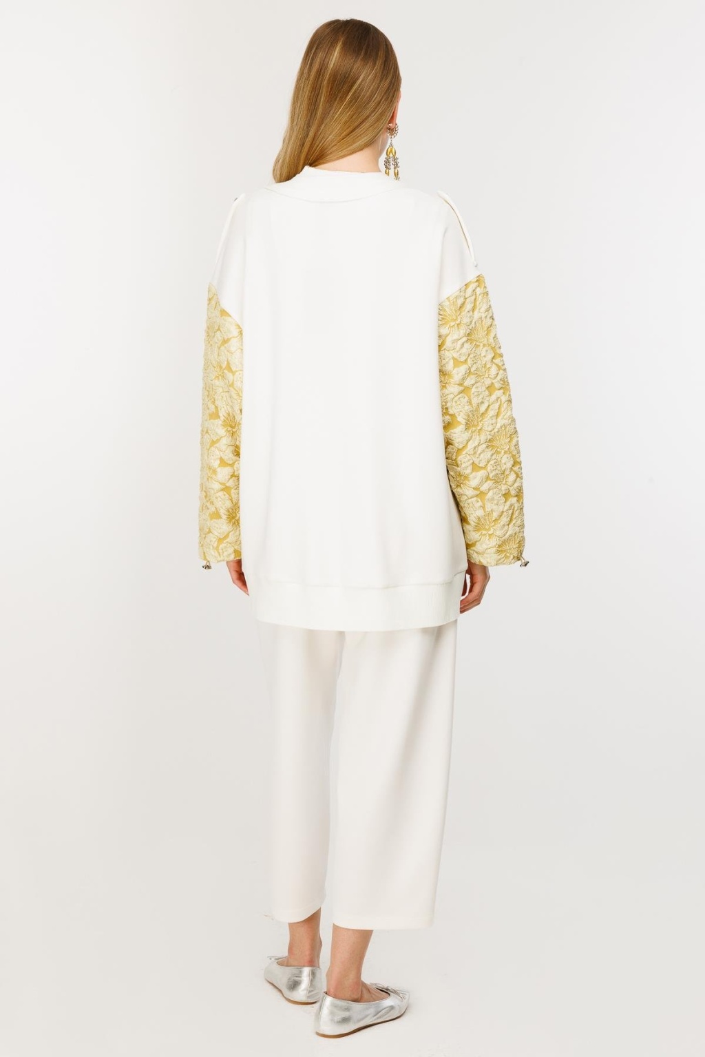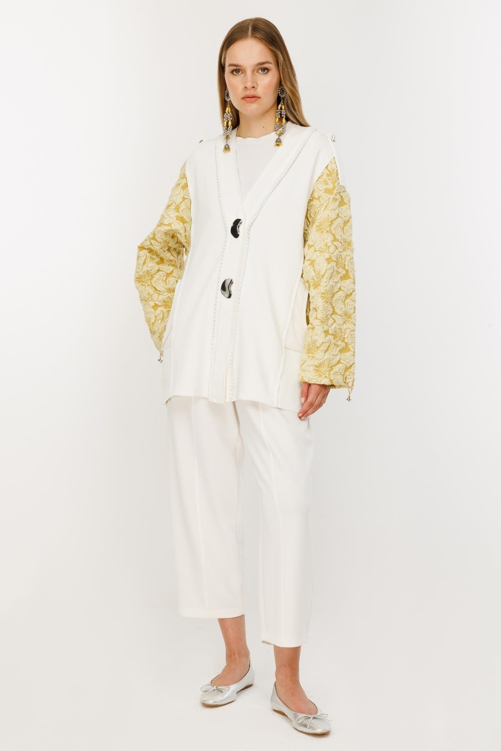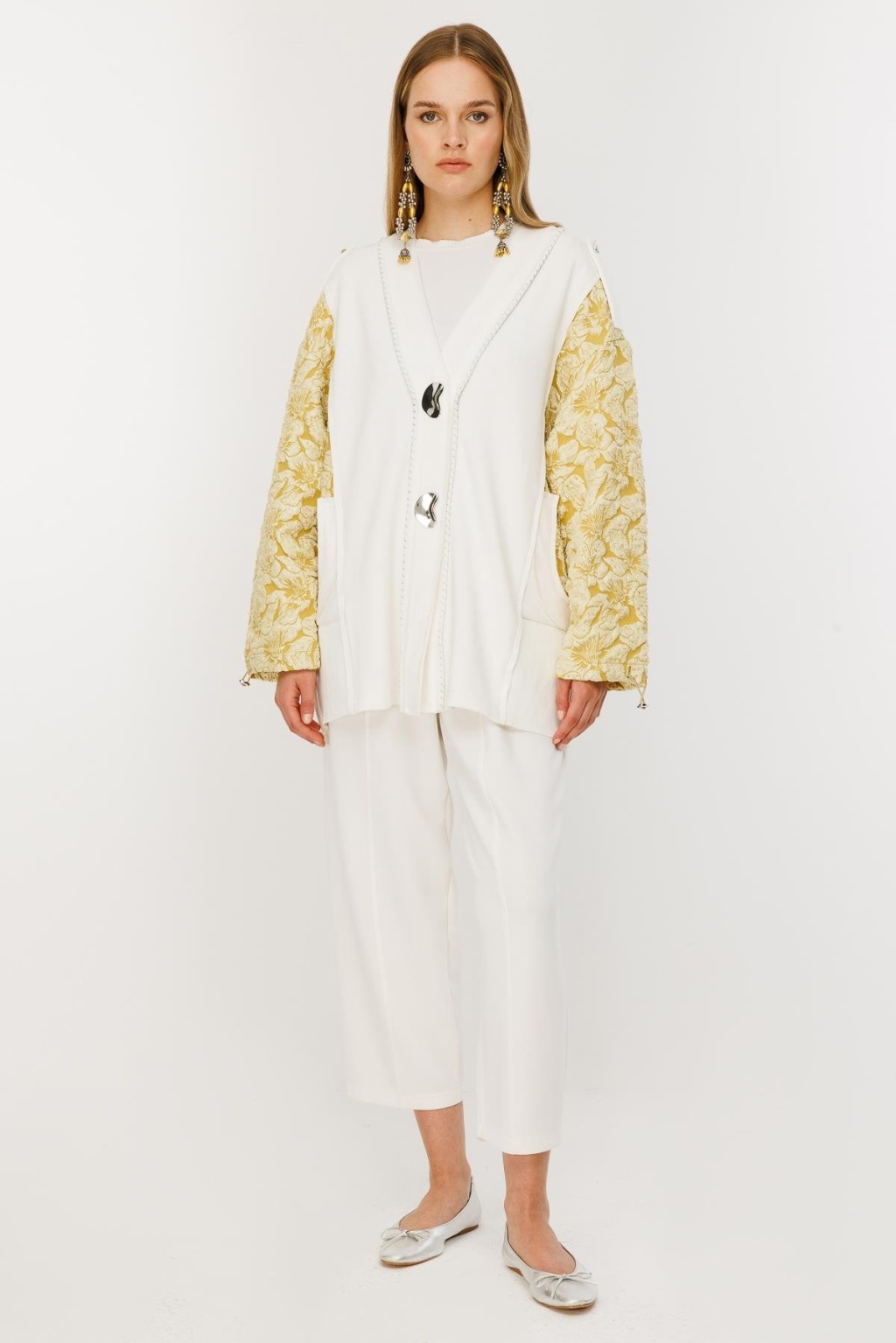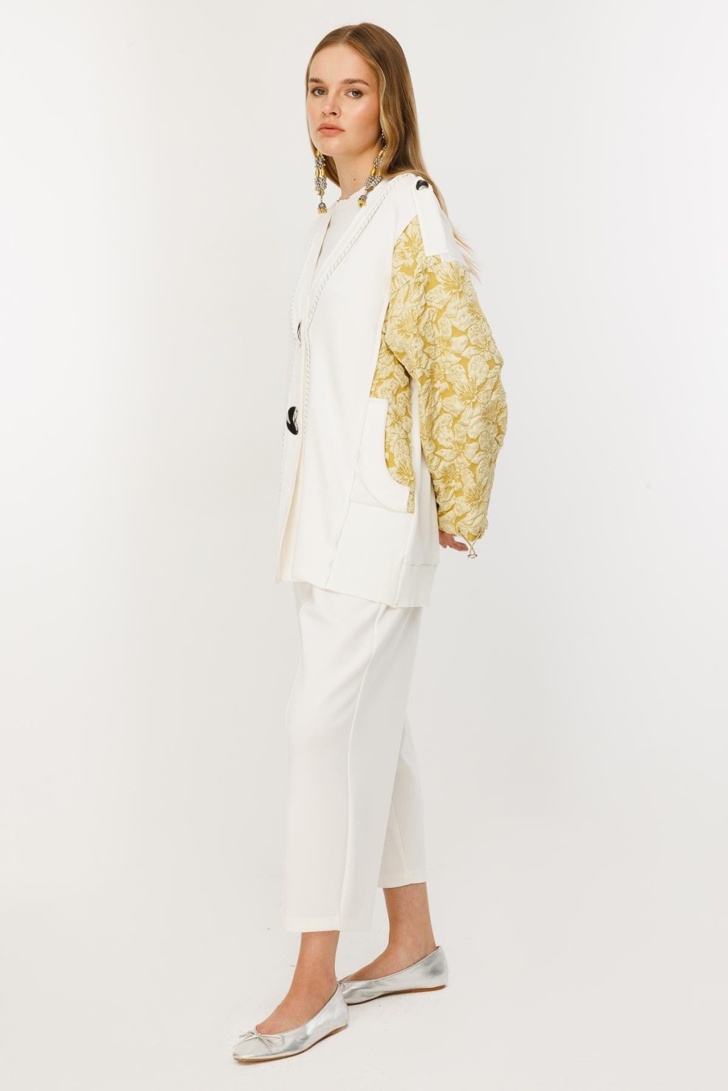 Pantolon beli lastikli, düğme kapamalı, kolları brokar kumaş mixli alt üst takım-