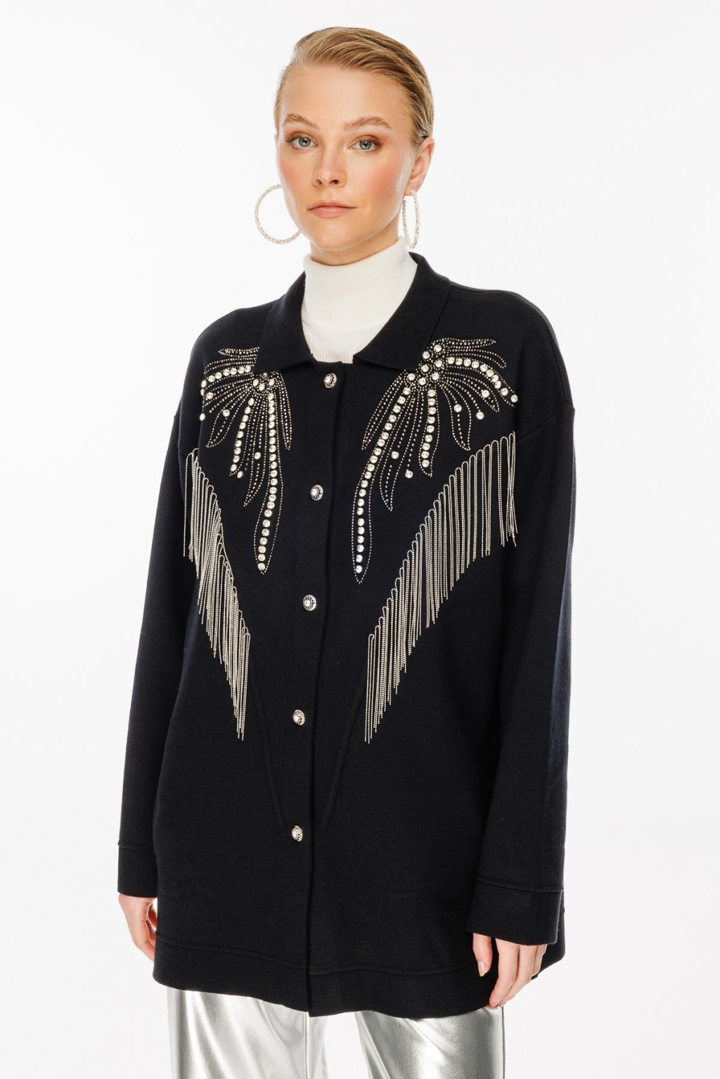 Çıt çıt kapamalı metal püsküllü taş işlemeli triko hırka-
