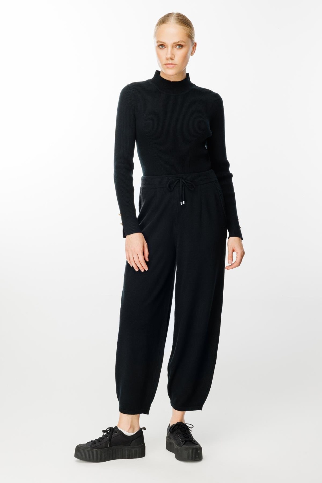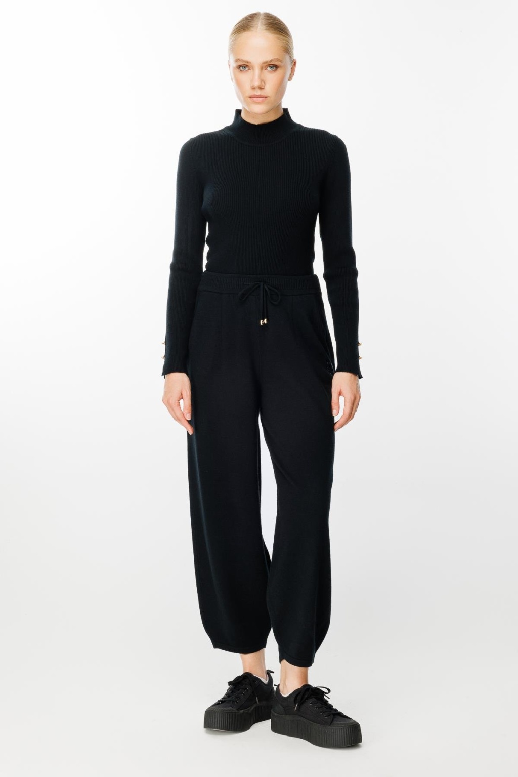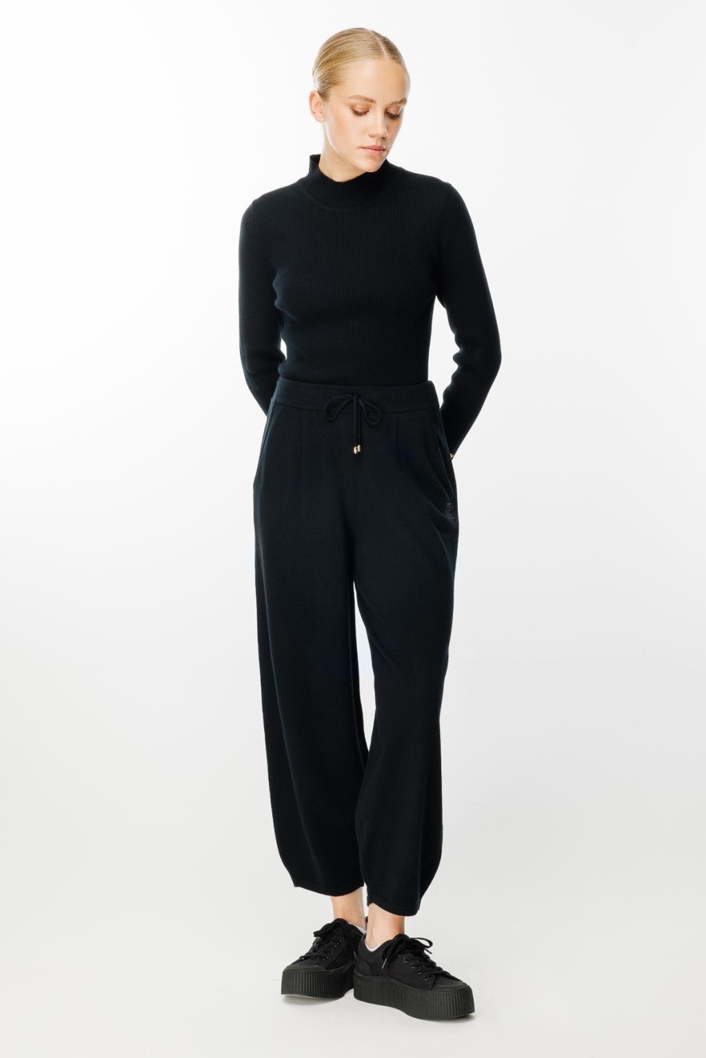 Belden bağlamalı paça detaylı cepli triko pantolon-