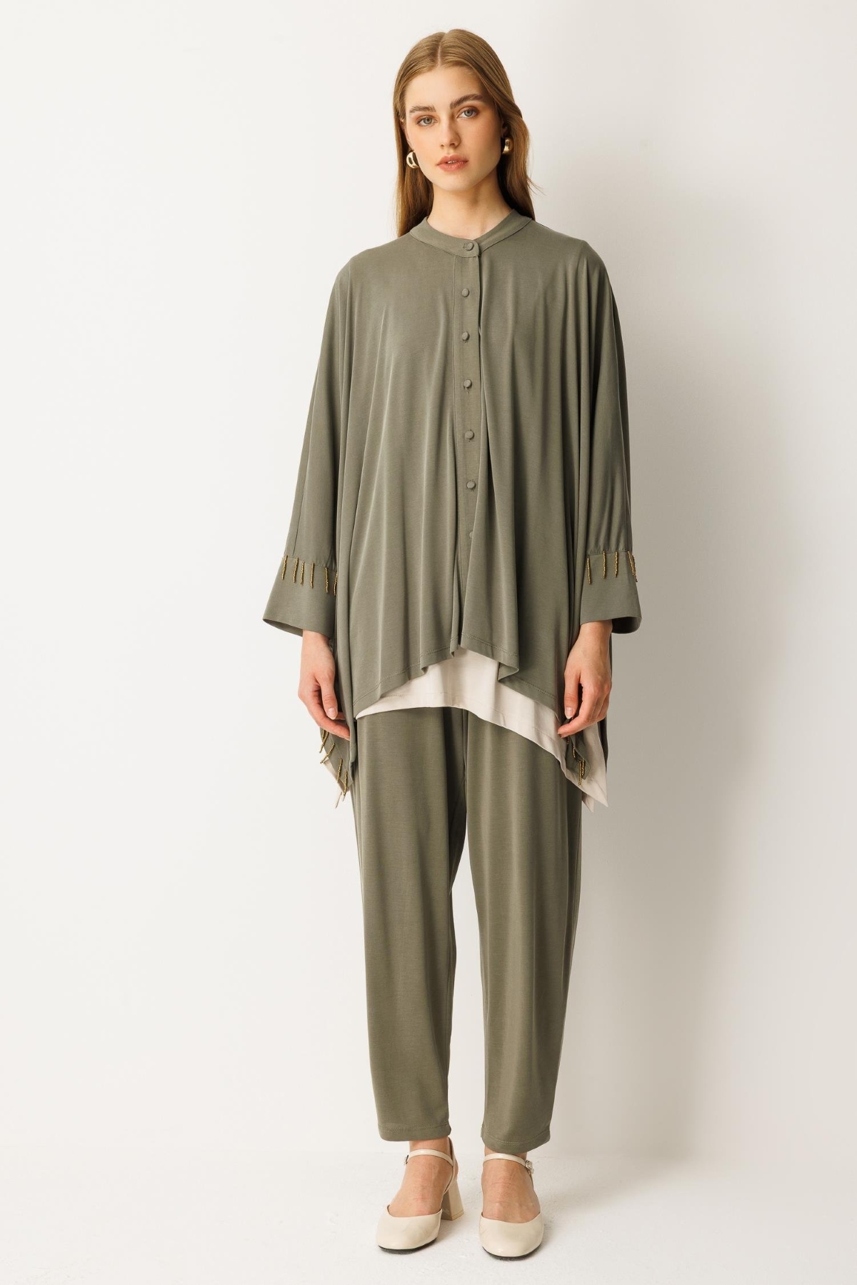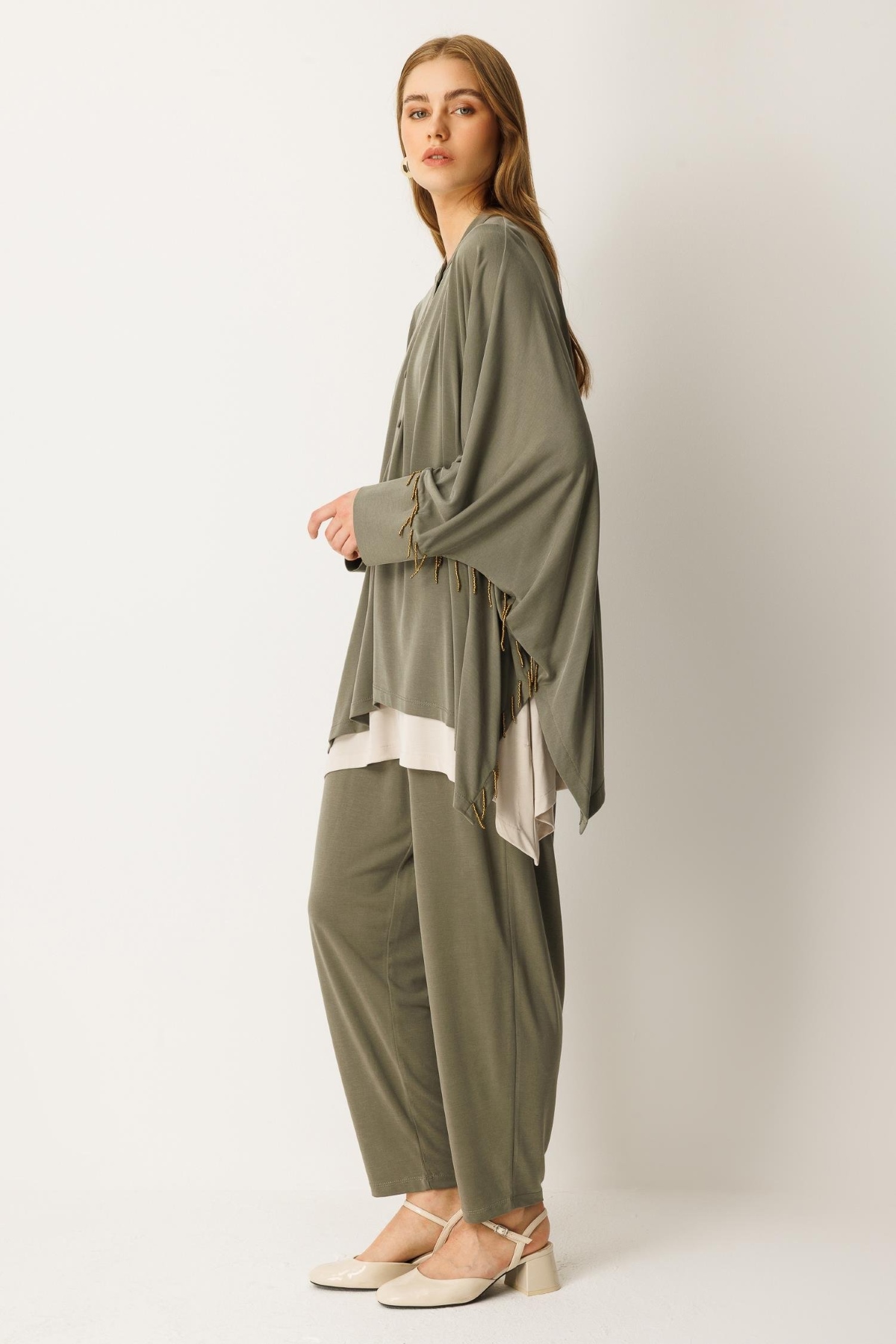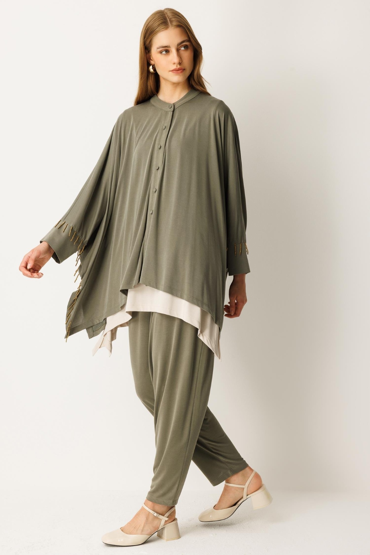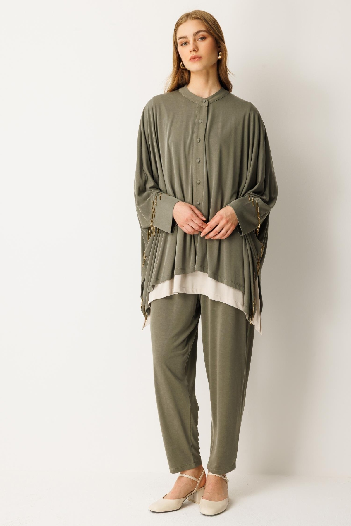 Pantolon beli lastikli, yarasa kol, boncuk işlemeli, düğme kapamalı alt üst takım-