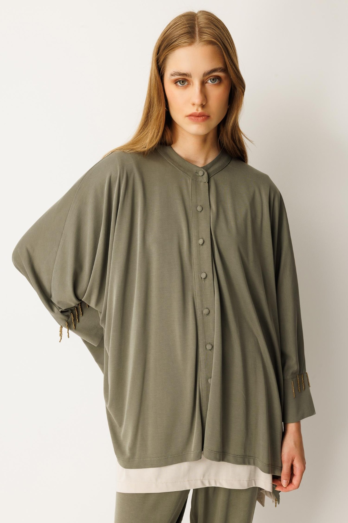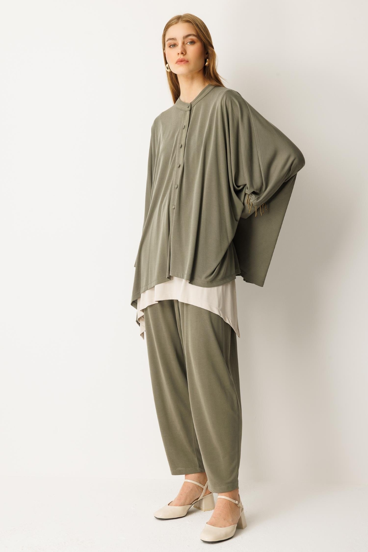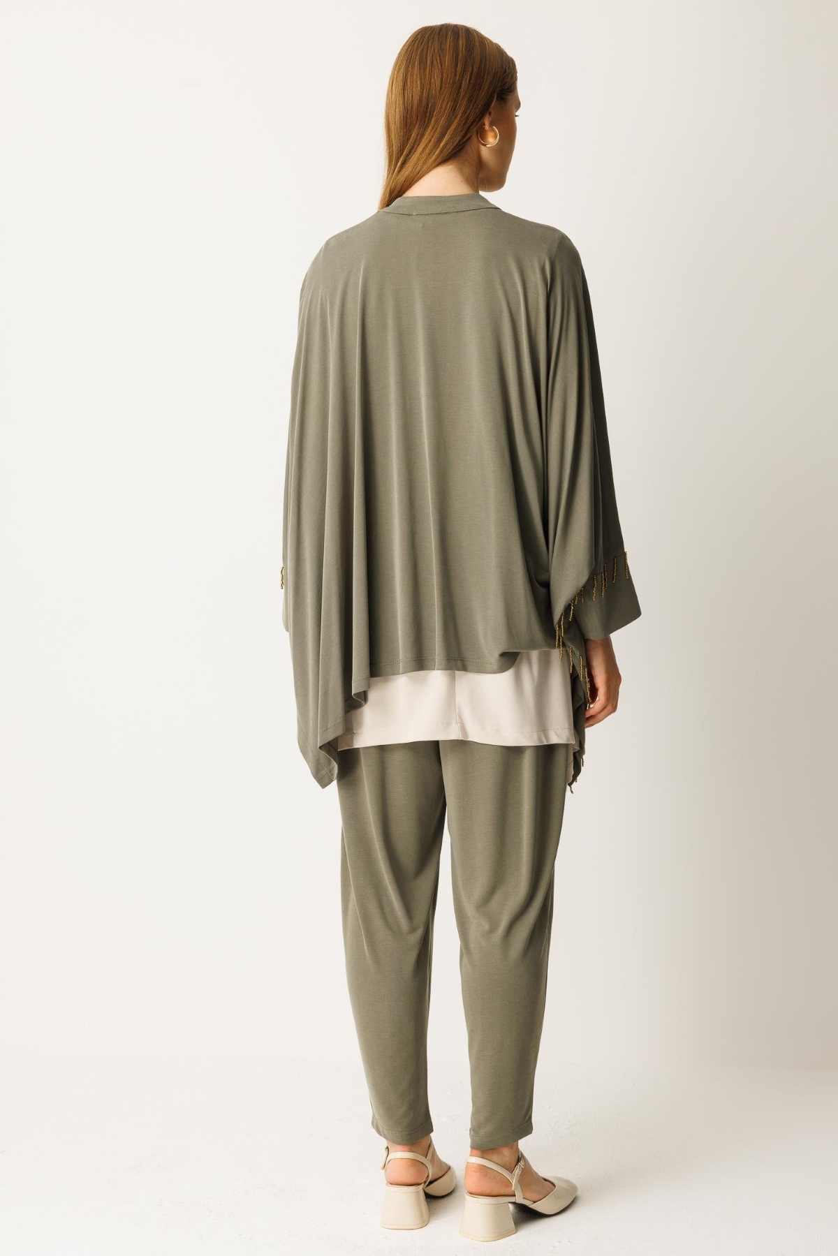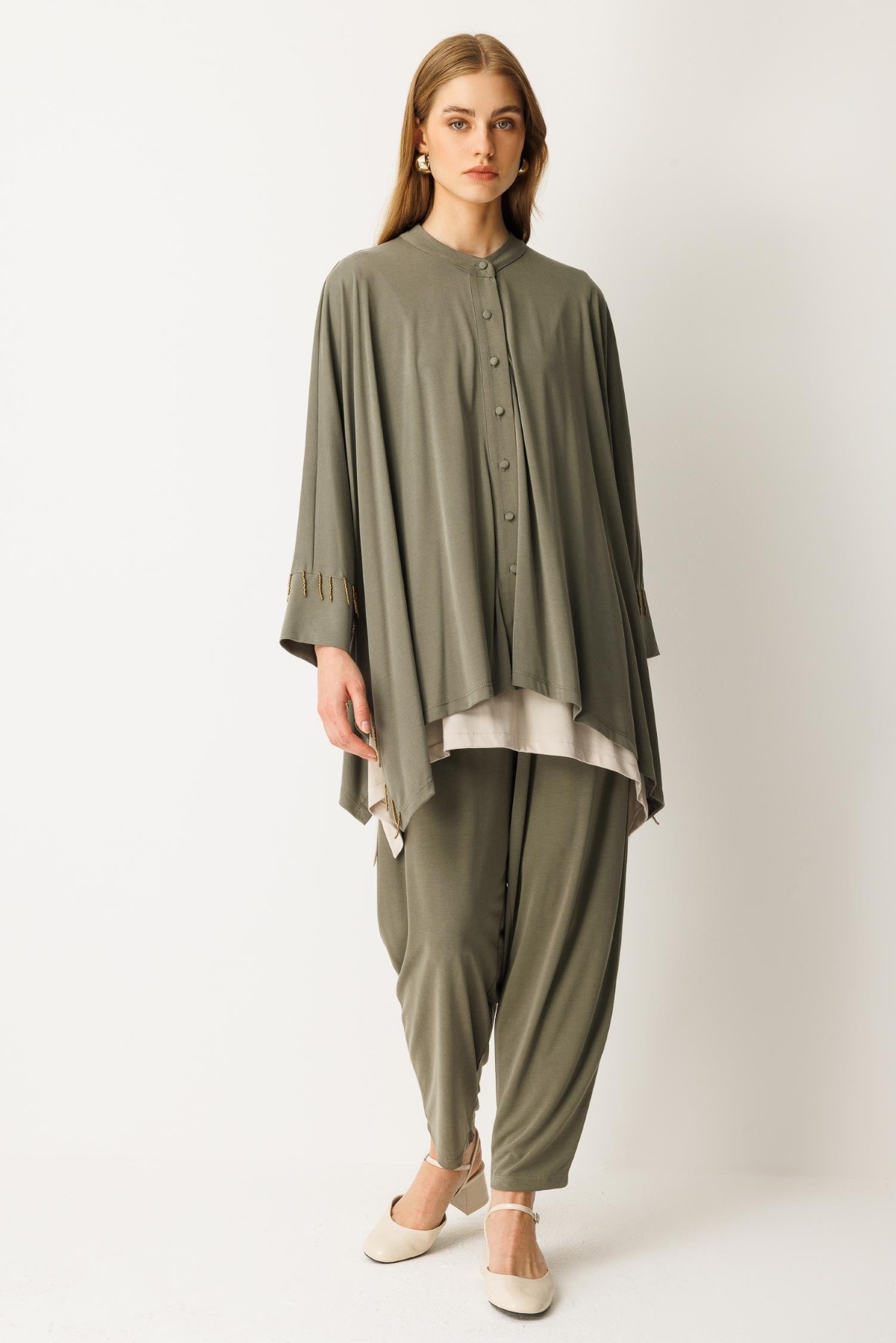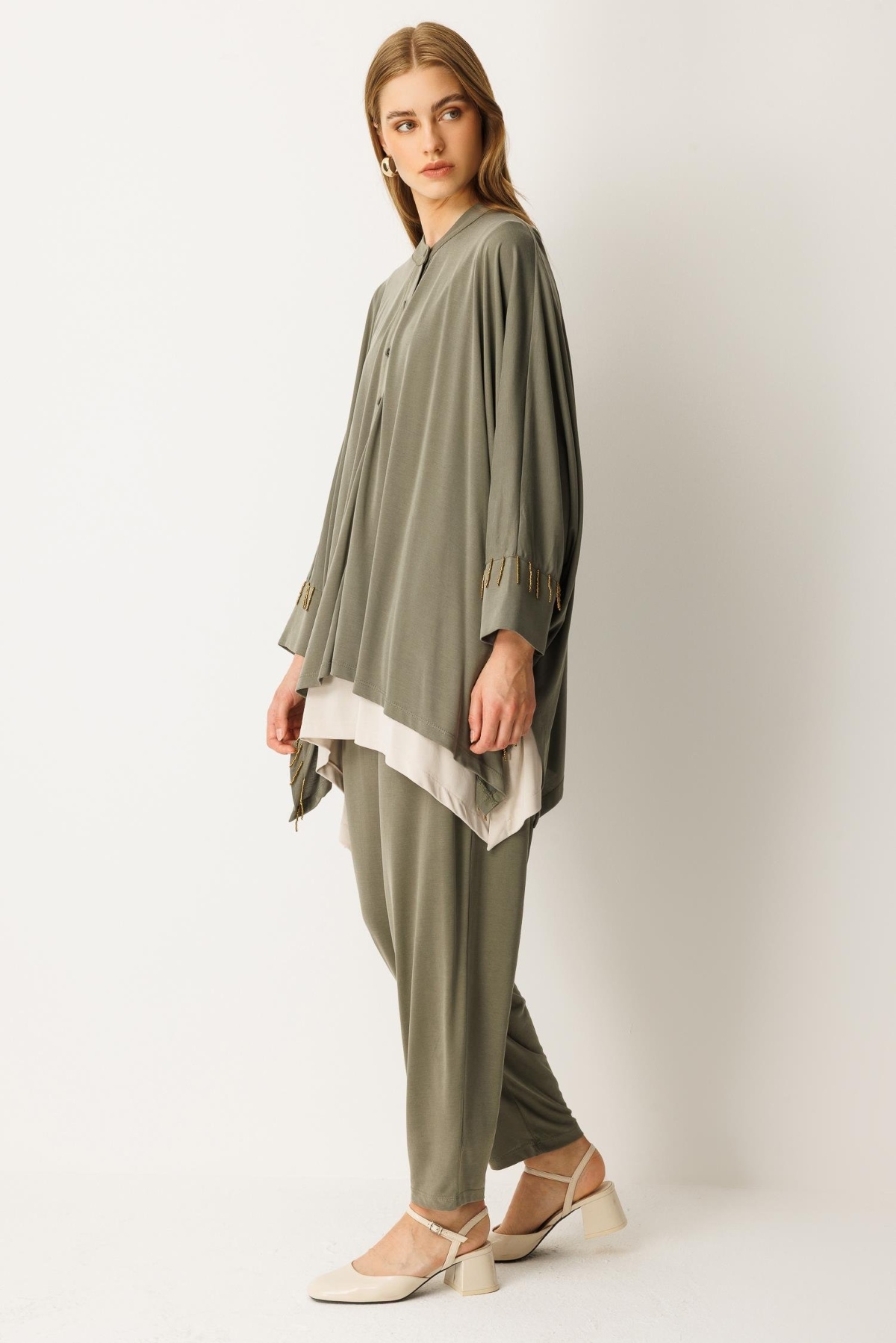 Pantolon beli lastikli, yarasa kol, boncuk işlemeli, düğme kapamalı alt üst takım-