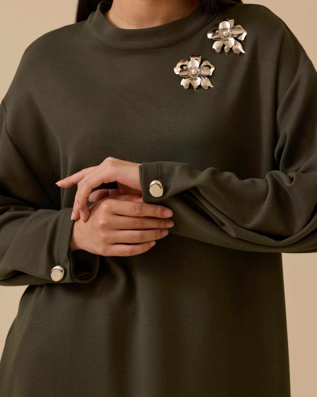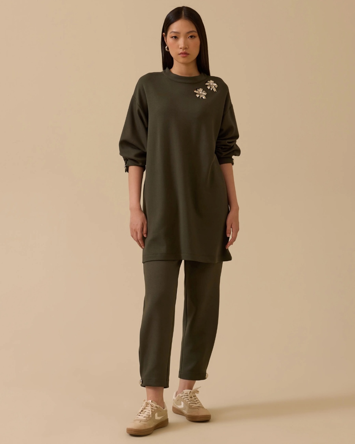 Aksesuar Detaylı Uzun Sweatshirt, modern kesimi ve omuz bölgesindeki zarif detaylarıyla sportif şıklık sunar.