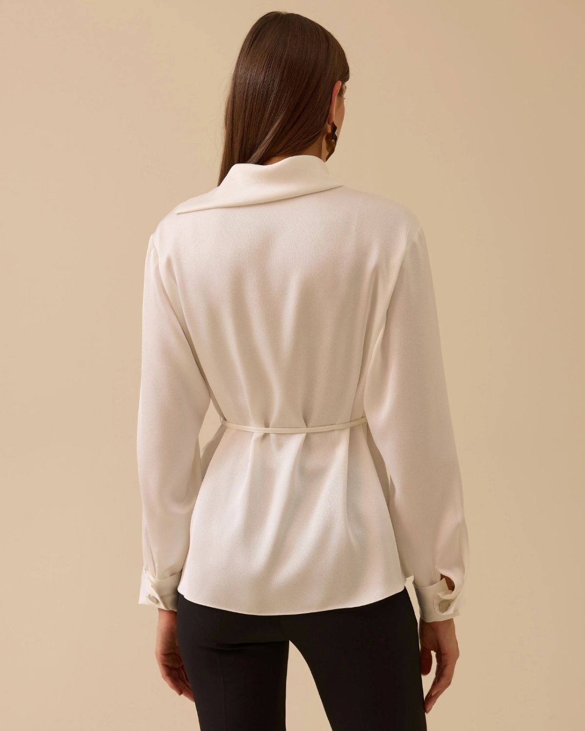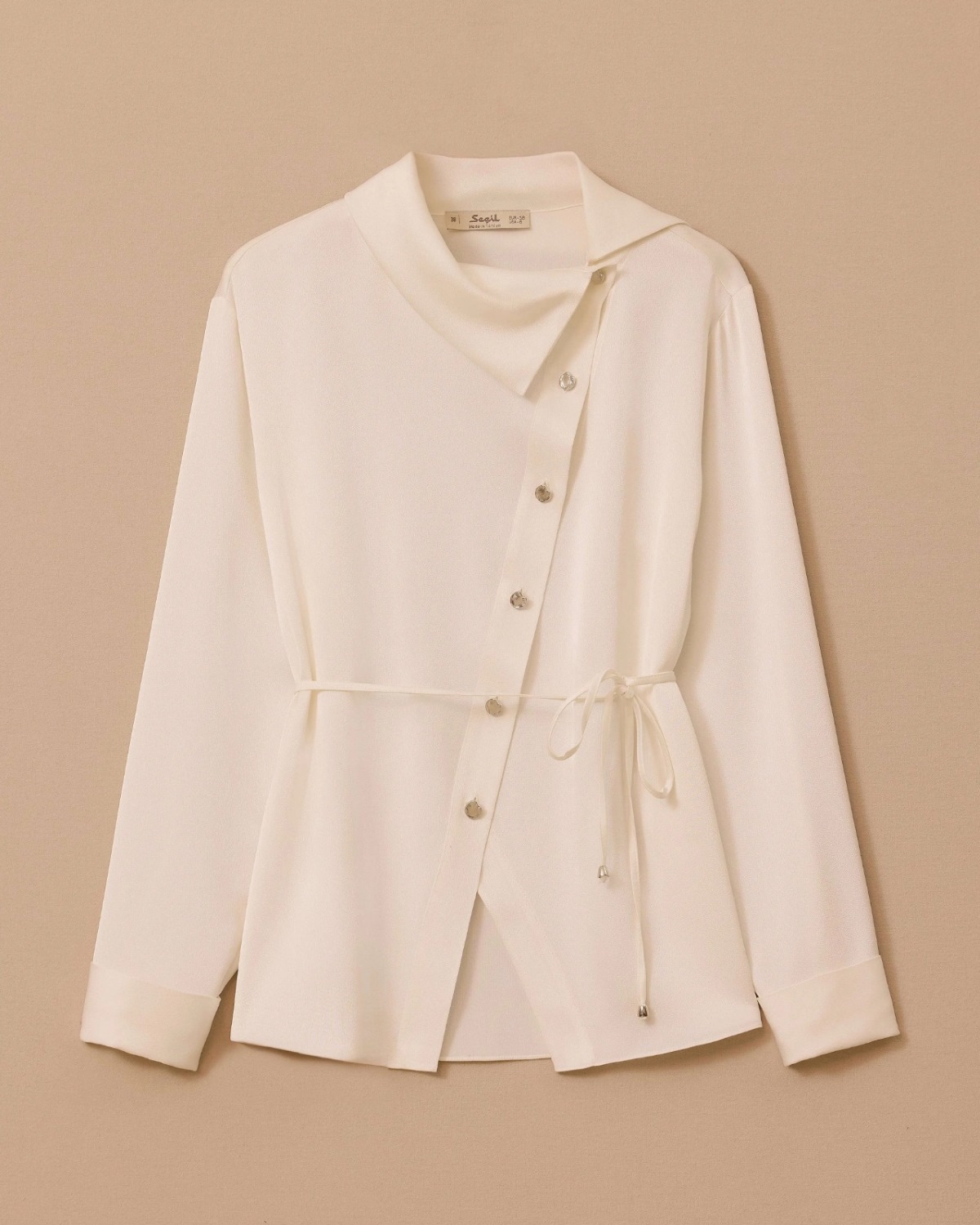Asimetrik Düğmeli Kuşaklı Gömlek, modern kesimi ve beli vurgulayan kuşağıyla öne çıkar.