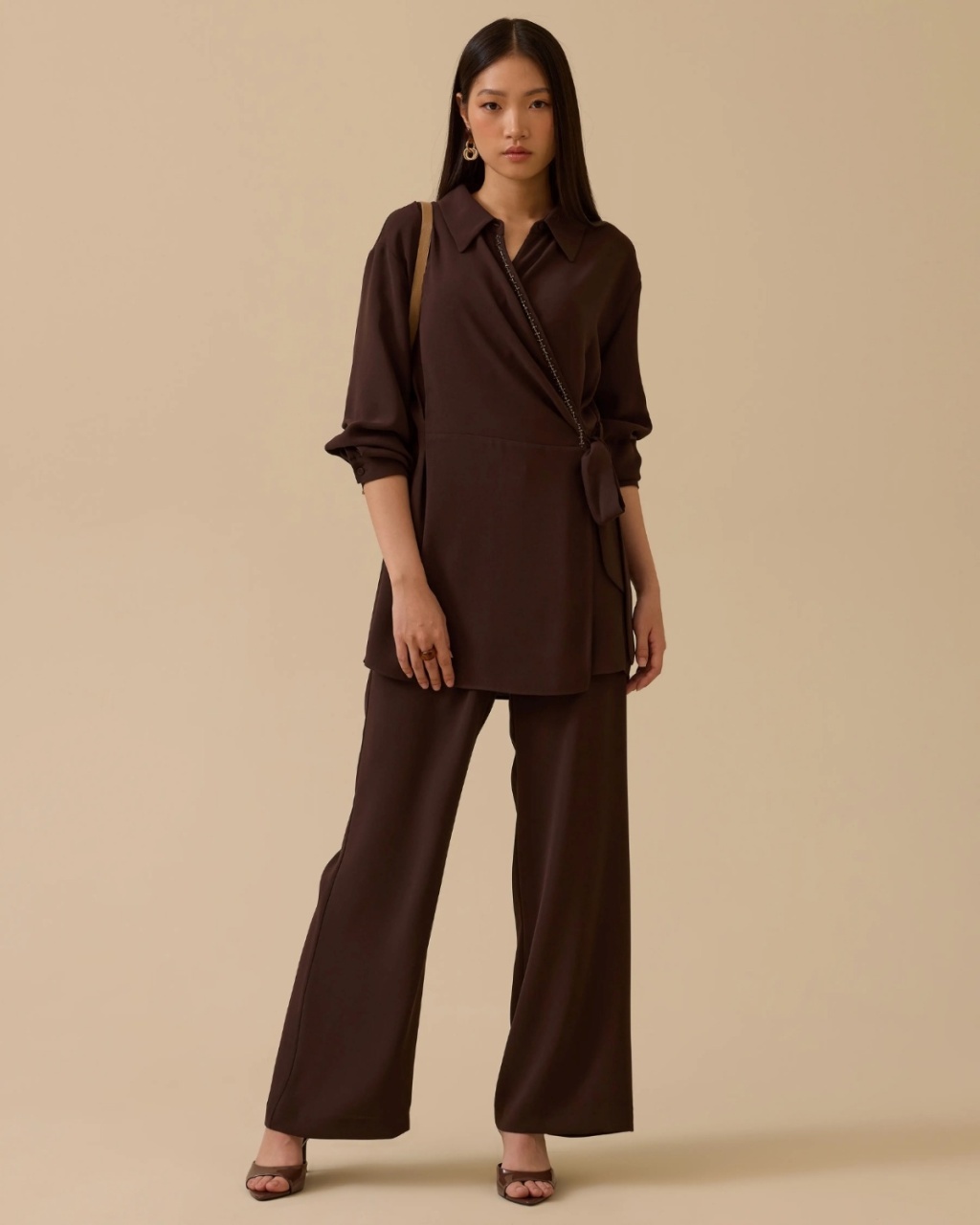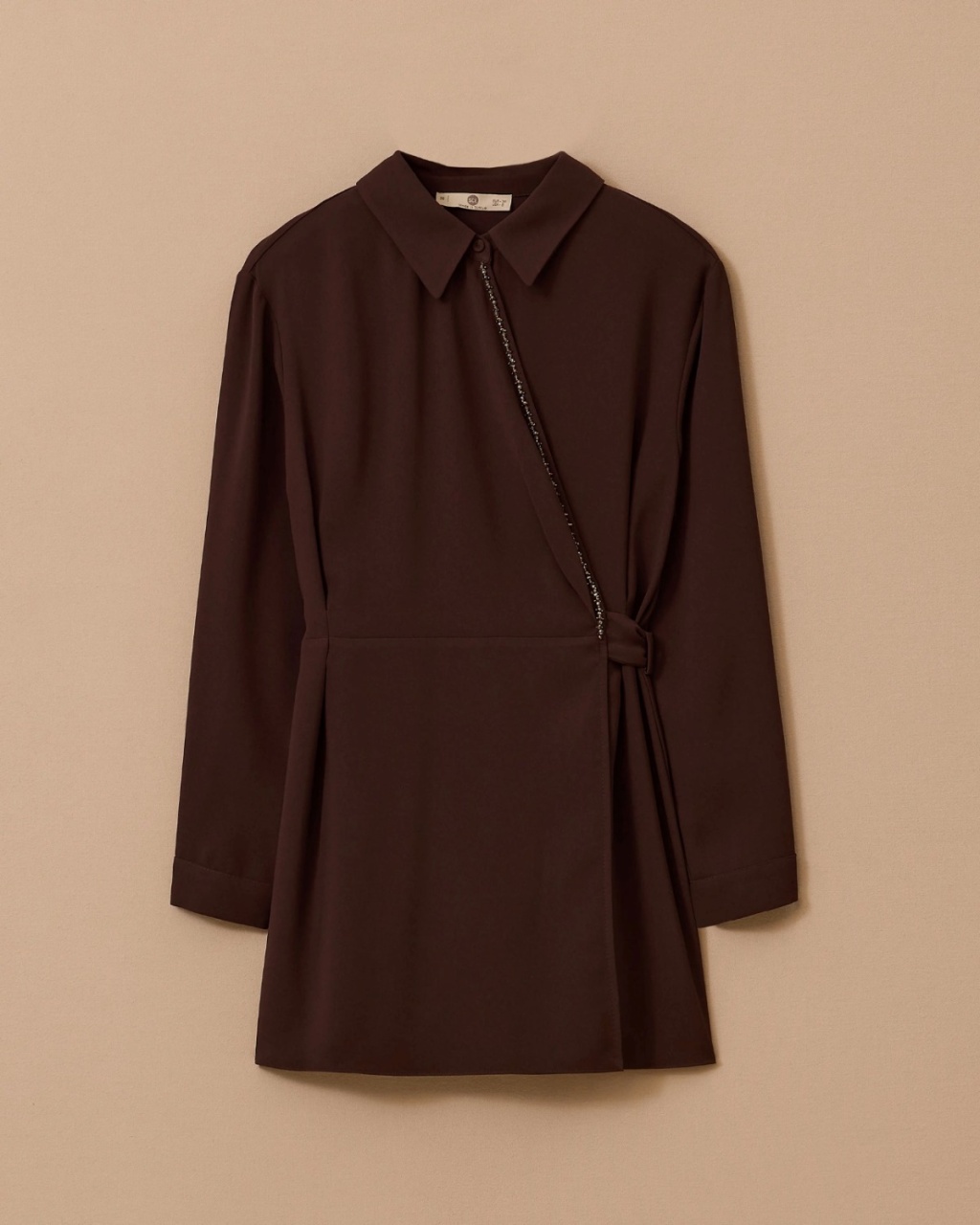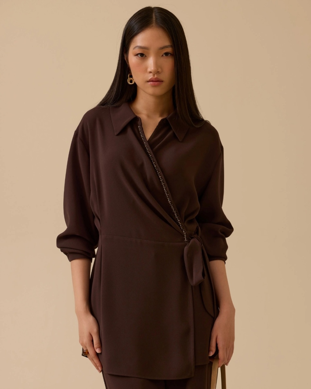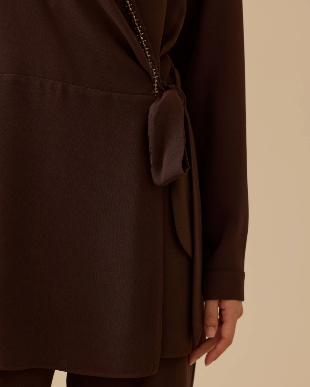 Boncuk Detaylı Bağlamalı Kruvaze Tunik, kruvaze kesimdeki boncuk süsleme ile ışıltı katar; belden bağlama ayarlanabilir şıklık sunar.