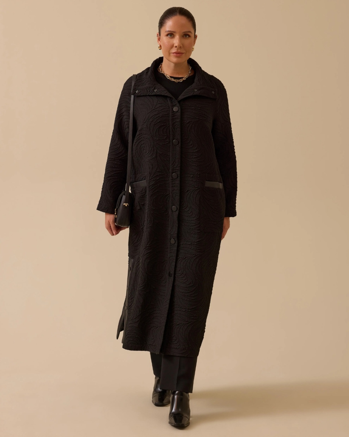 Büyük Beden Desenli Düğmeli Uzun Kap, kabartmalı dokusu ve uzun formuyla zarif bir görünüm sunar.
