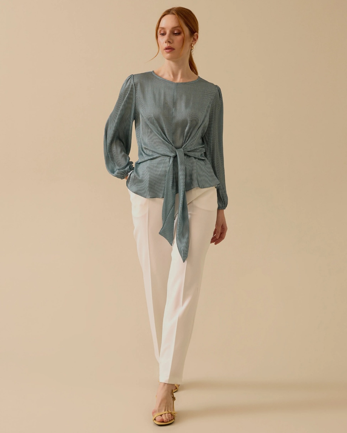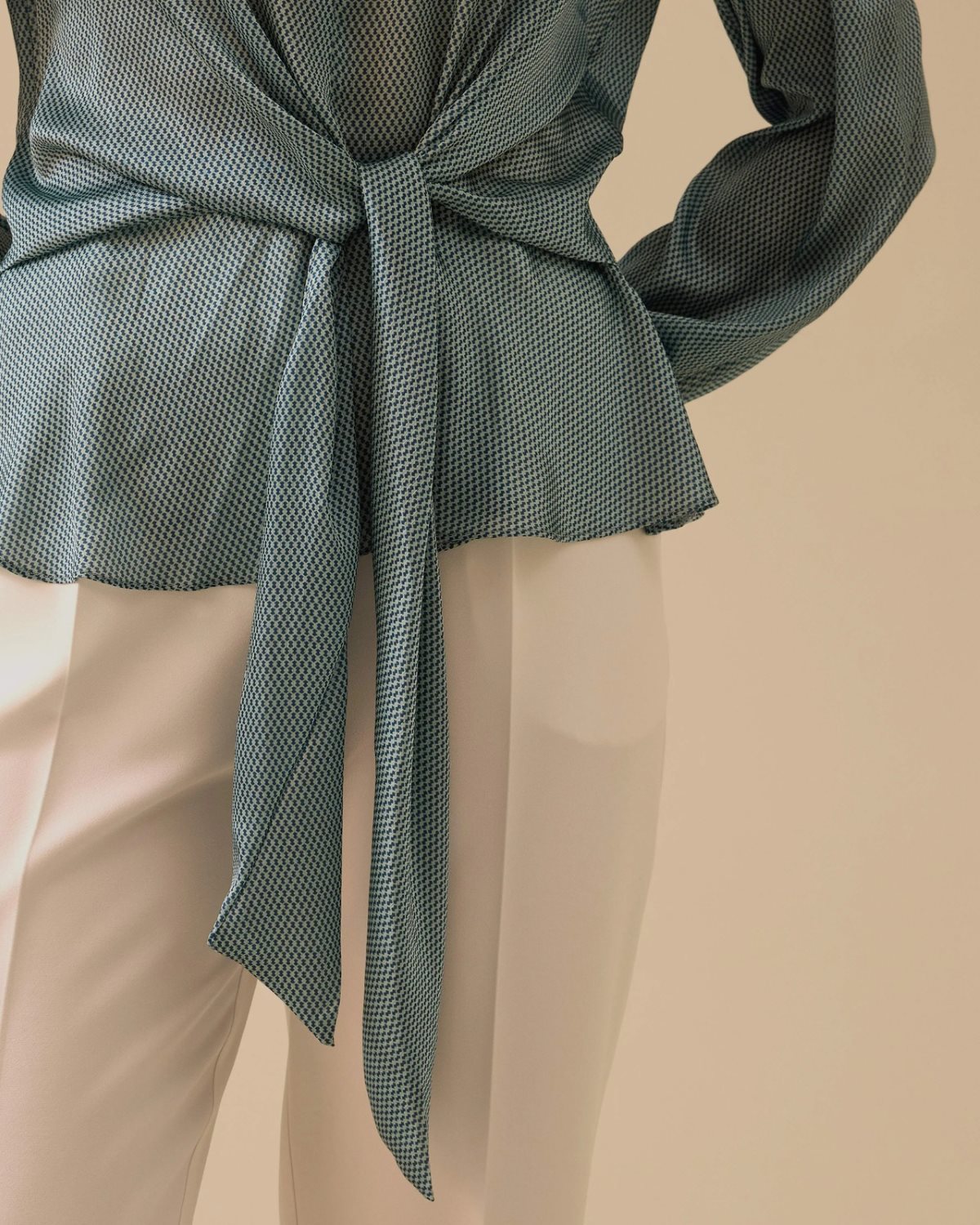 Desenli Belden Bağlamalı Bluz, şık deseni ve ayarlanabilir bel bağlama detayıyla feminen bir görünüm sunar, rahat ve modern kombinler için idealdir.
