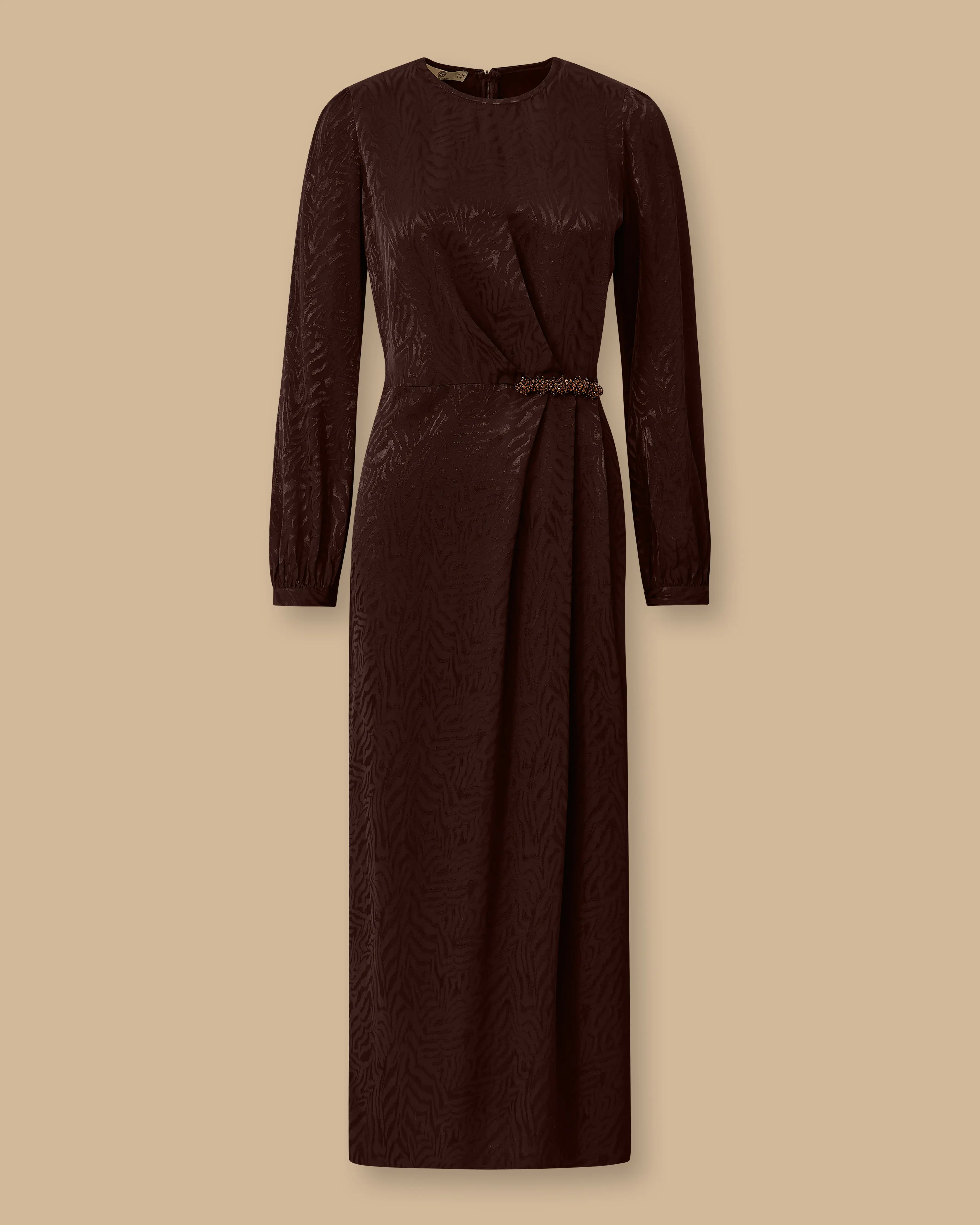 Desenli Boncuk Detaylı Saten Elbise, parlak saten dokusu ve ışıltılı boncuk detaylarıyla feminen ve zarif bir görünüm sunar.