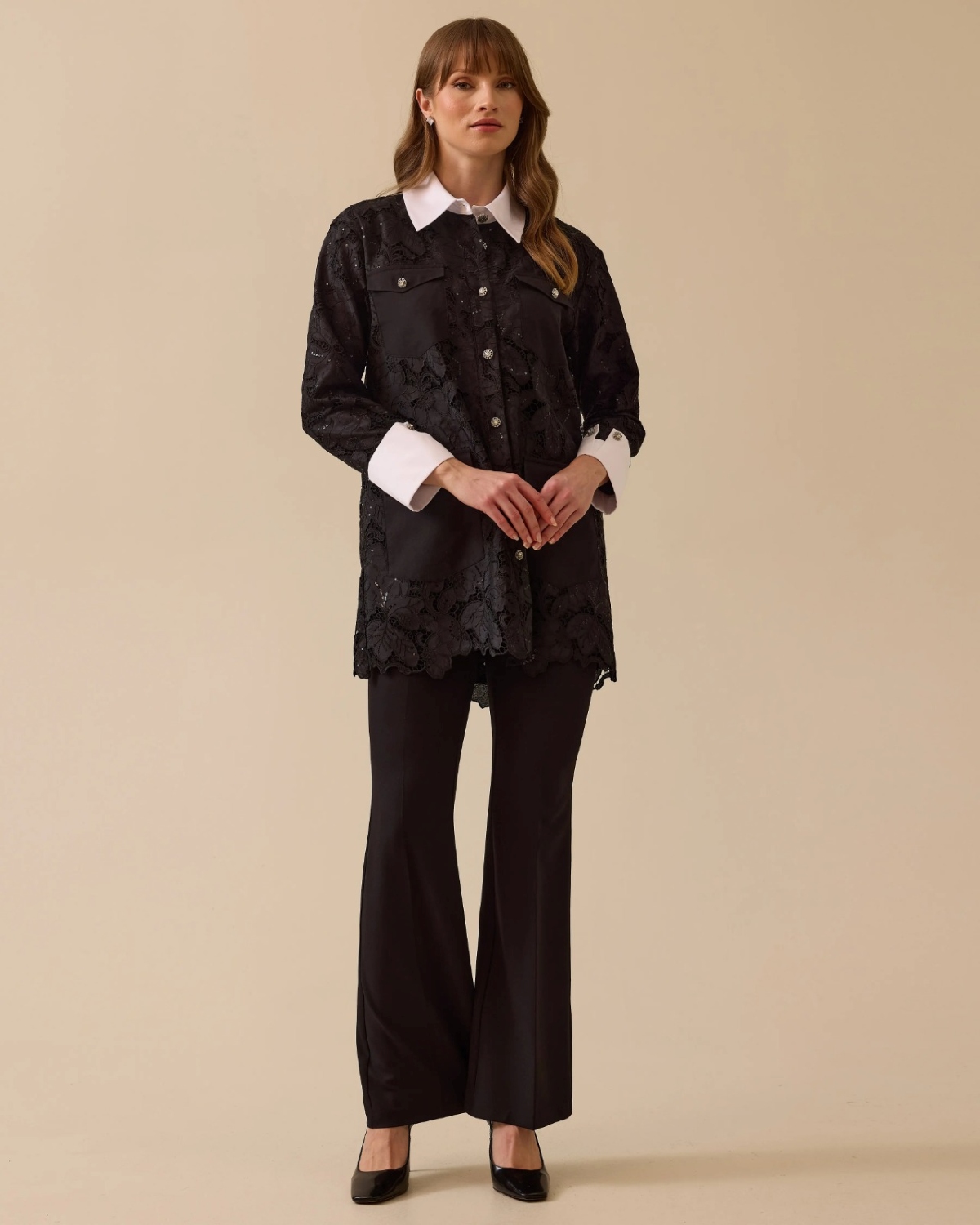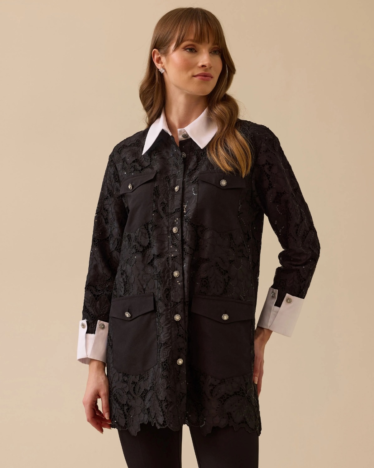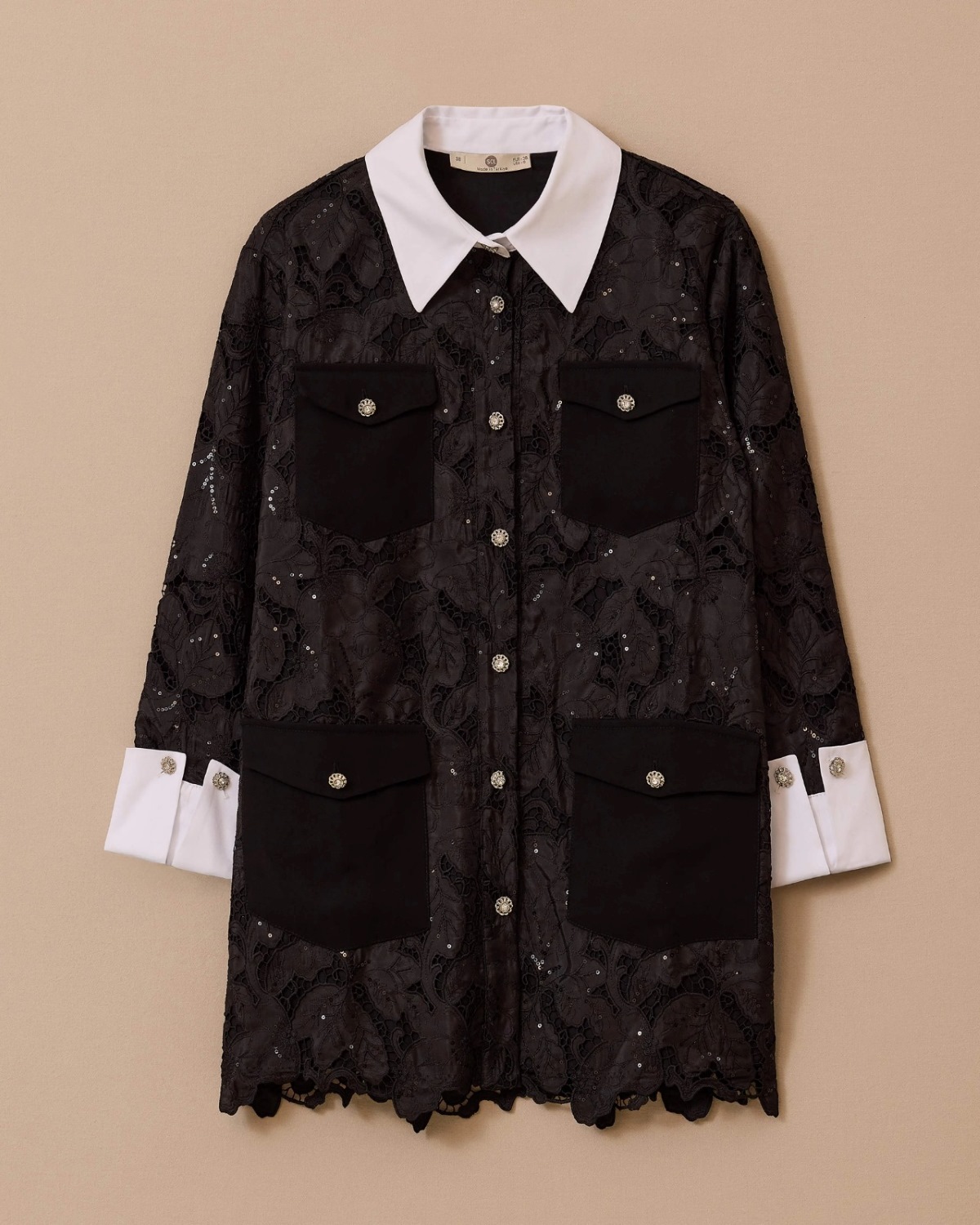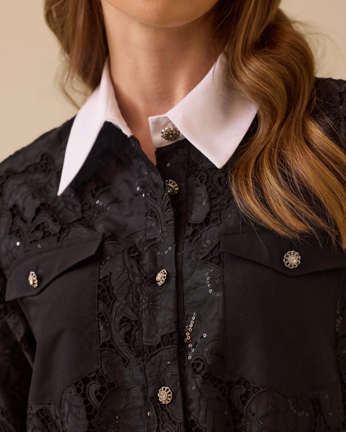 Desenli Dantel Detaylı Düğmeli Gömlek, dikkat çeken dantel dokusu ve desenli yapısıyla şık bir görünüm sunar.