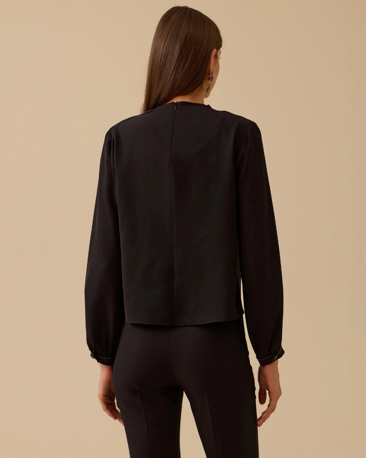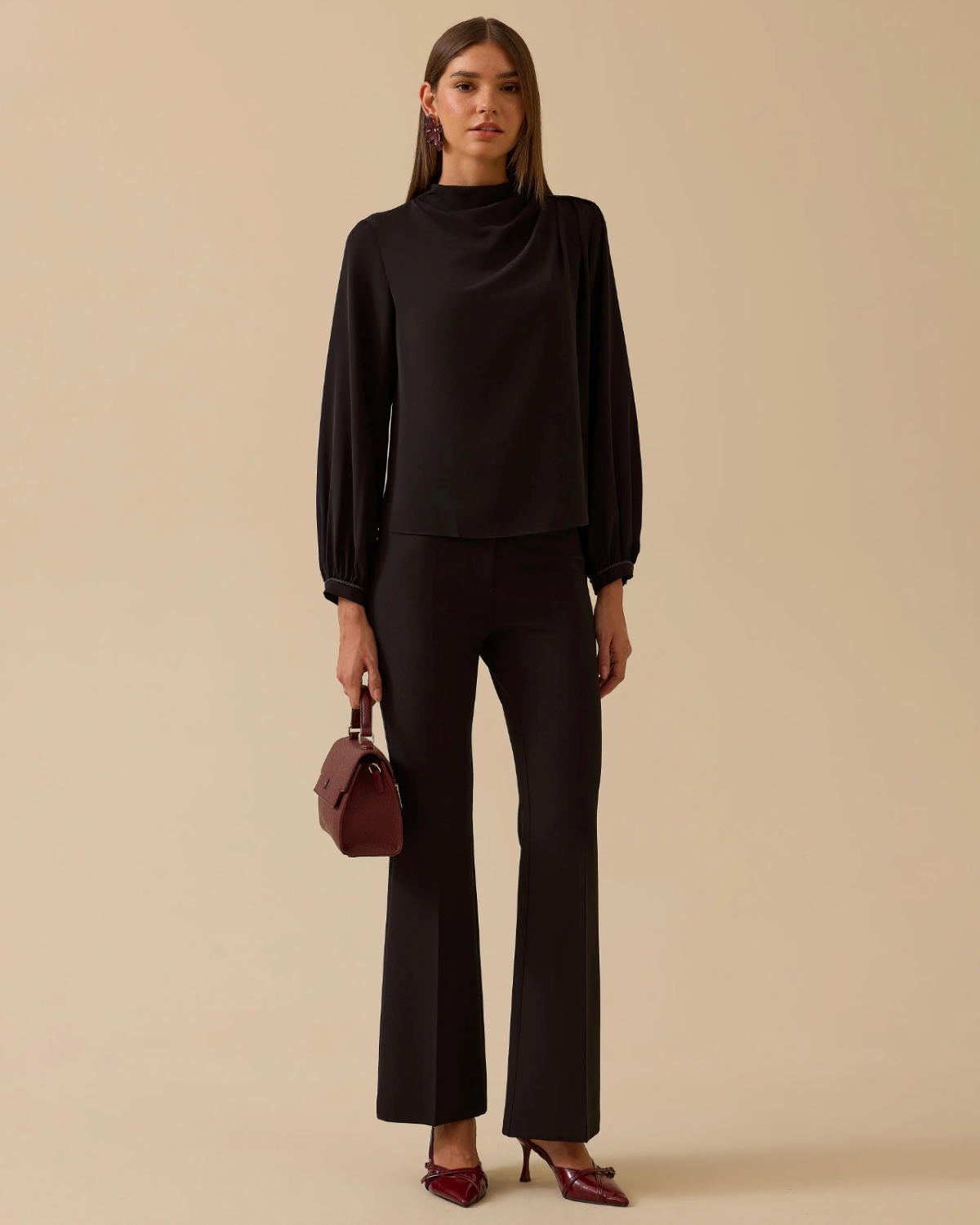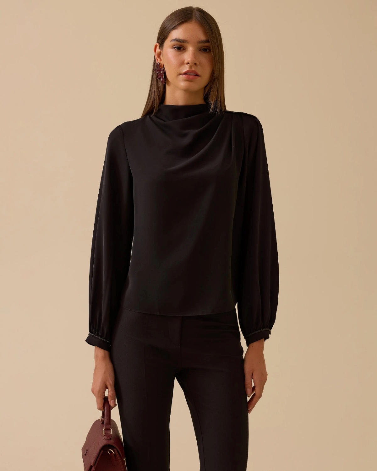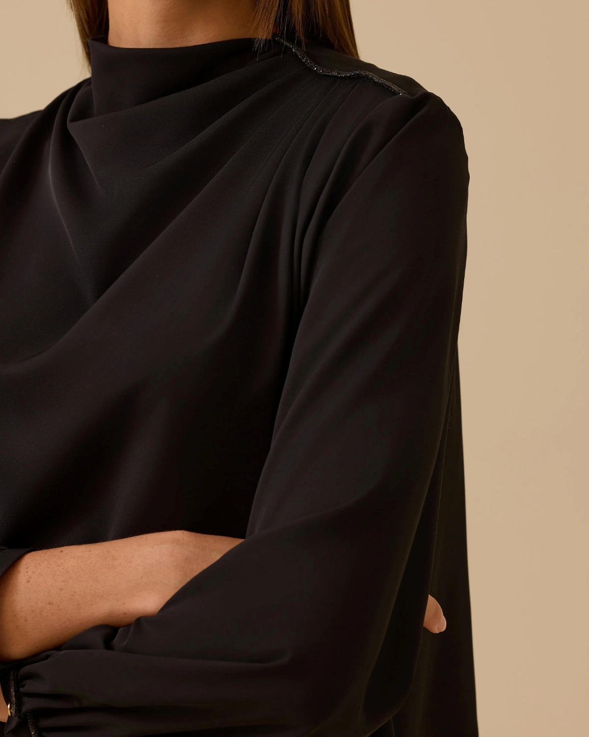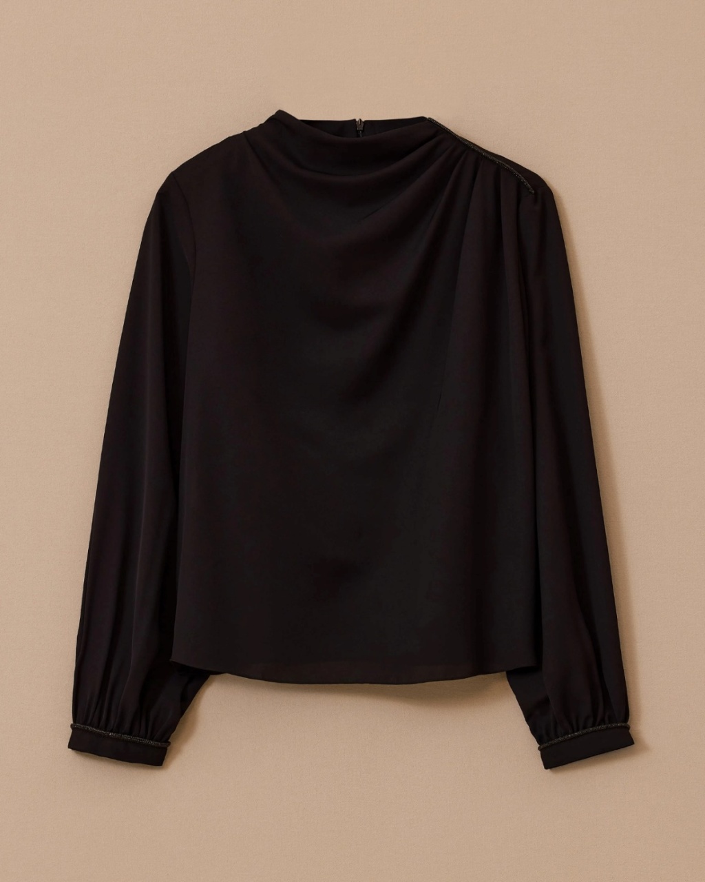 Dik Yaka Drape Detaylı Bluz, omuzdaki drape ayrıntısıyla şık ve modern bir görünüm sunar.