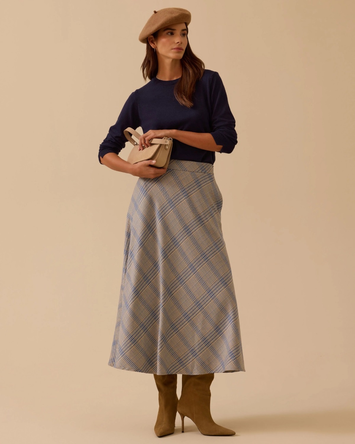 Ekose Desenli Kloş Etek, yüksek bel, dökümlü tasarım, şık ve rahat kombinlere uygun.
