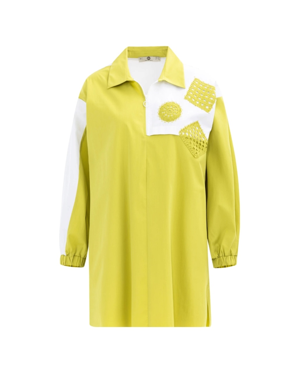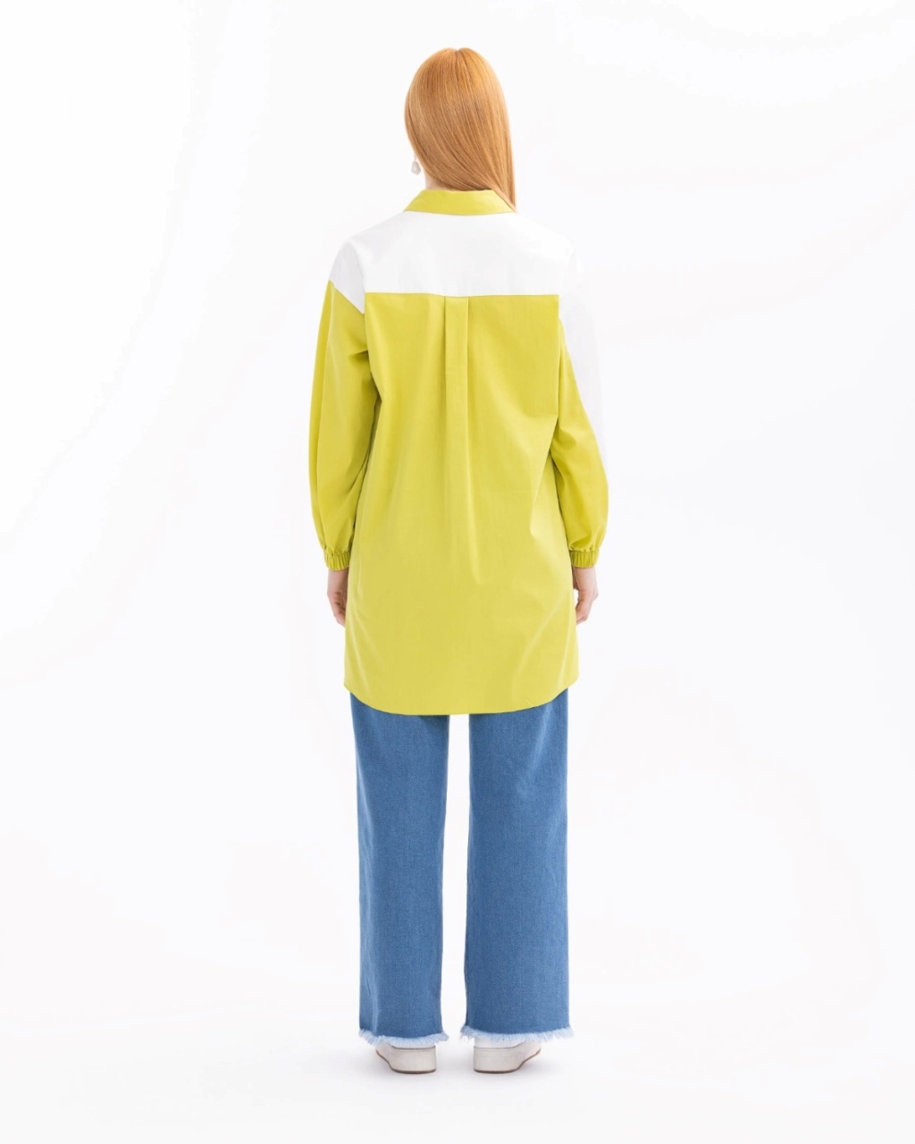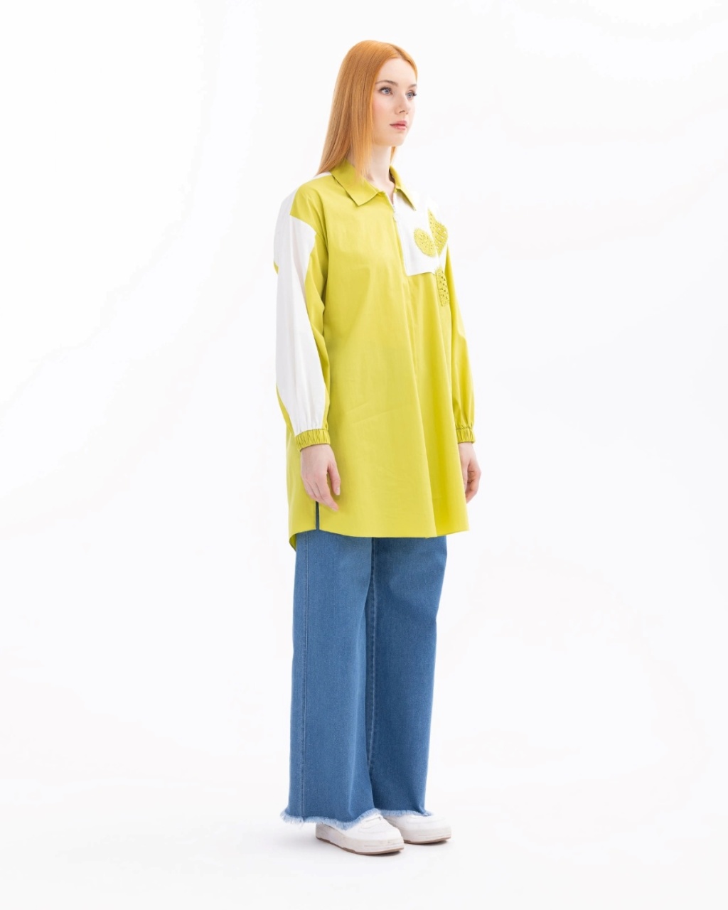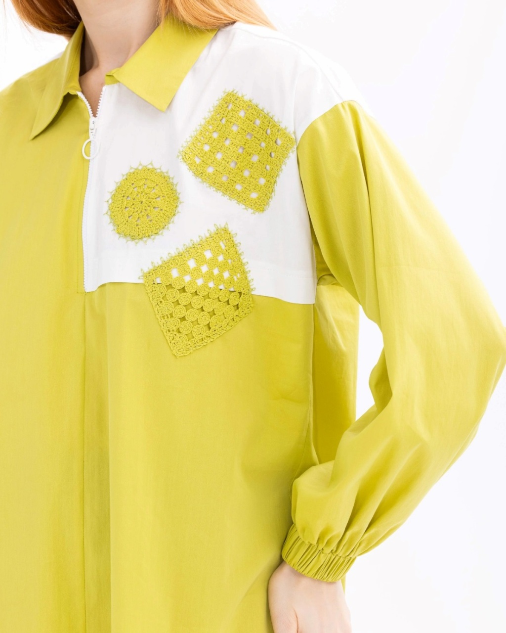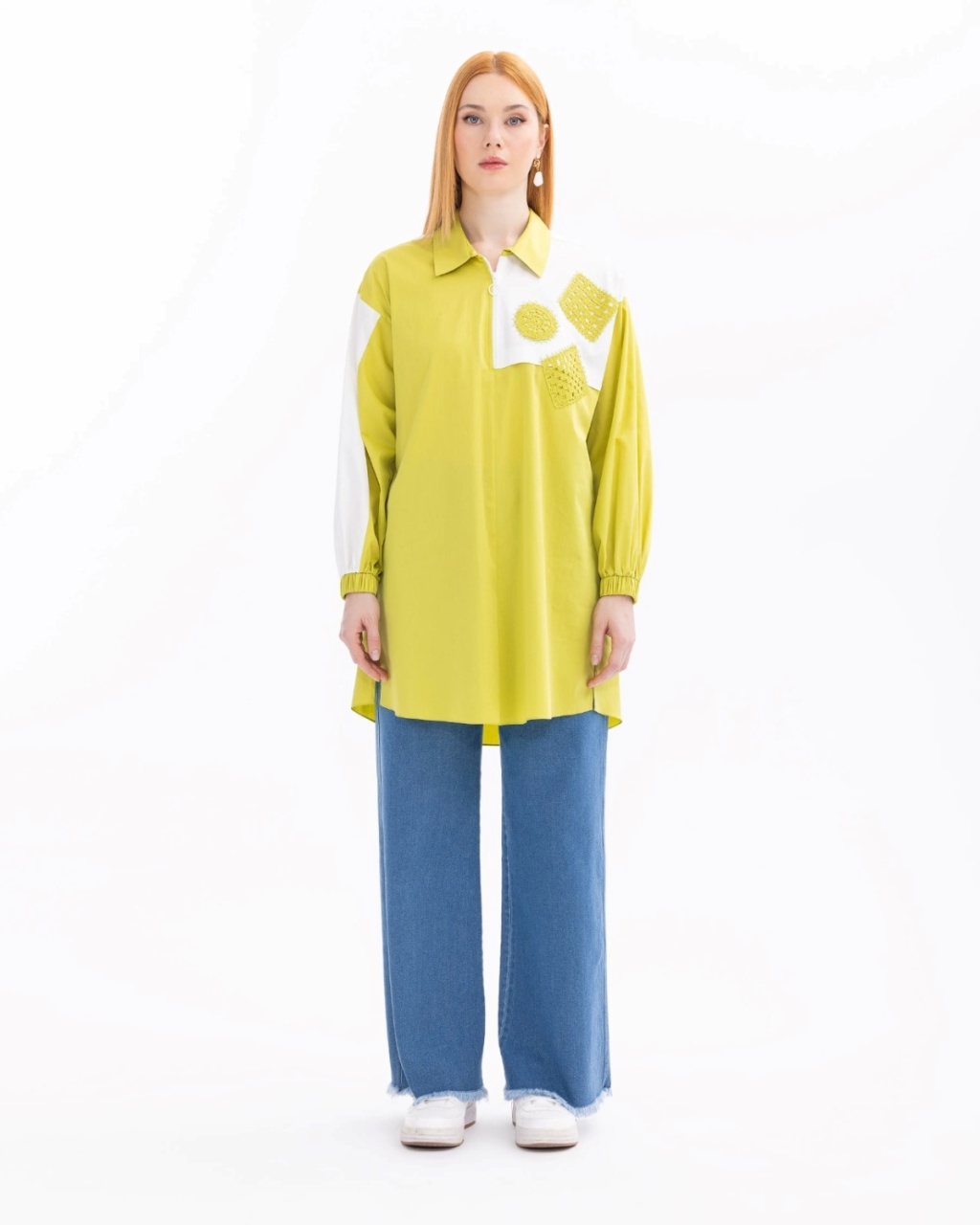 Fermuarlı Düşük Kol Tunik, tarz ve konforu mükemmel bir şekilde bir araya getiriyor. Bu tunik, fermuarlı önüyle giyme kolaylığı sağlarken modern bir dokunuş sunuyor. Diz üstü boyu ve gömlek yakası ile rahat bir zarafet sunuyor. Gündelik bir dışarı çıkma veya daha resmi bir toplantı için olsun, bu tunik pratikliği şık tarzla birleştiren çok yönlü bir gardırop temelidir.