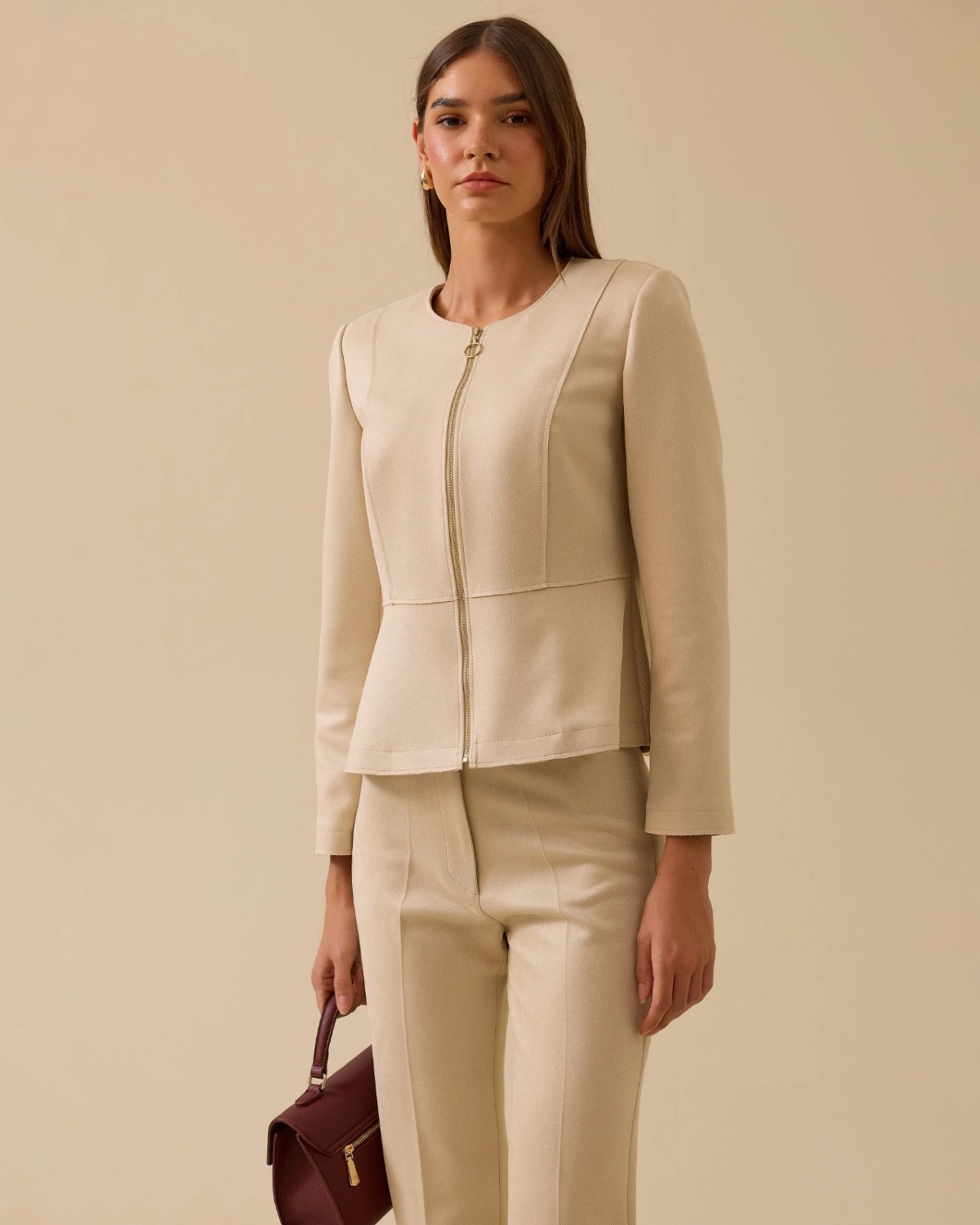 Fermuarlı Sıfır Yaka Kısa Ceket, modern ve zarif tasarımıyla yapılandırılmış hatlara sahip, konforlu kumaş, günlük ve ofis kombinlerine uygun şık görünüm sunar.