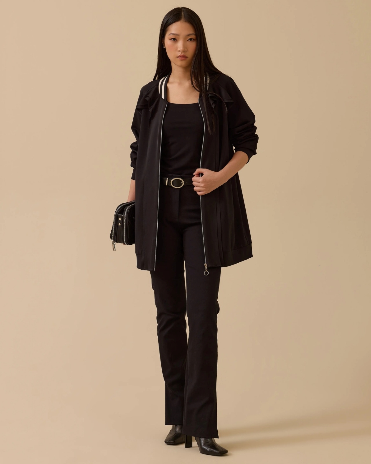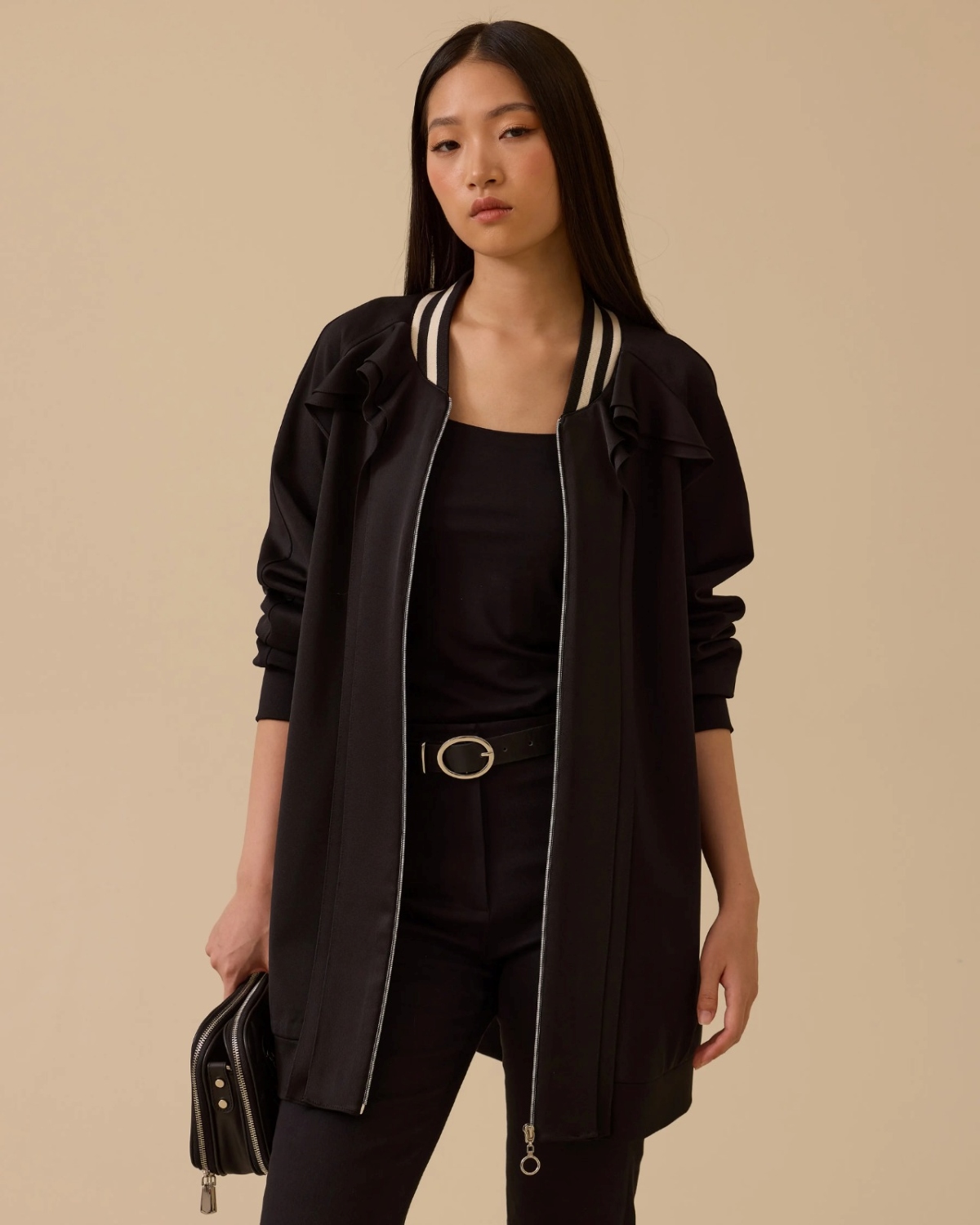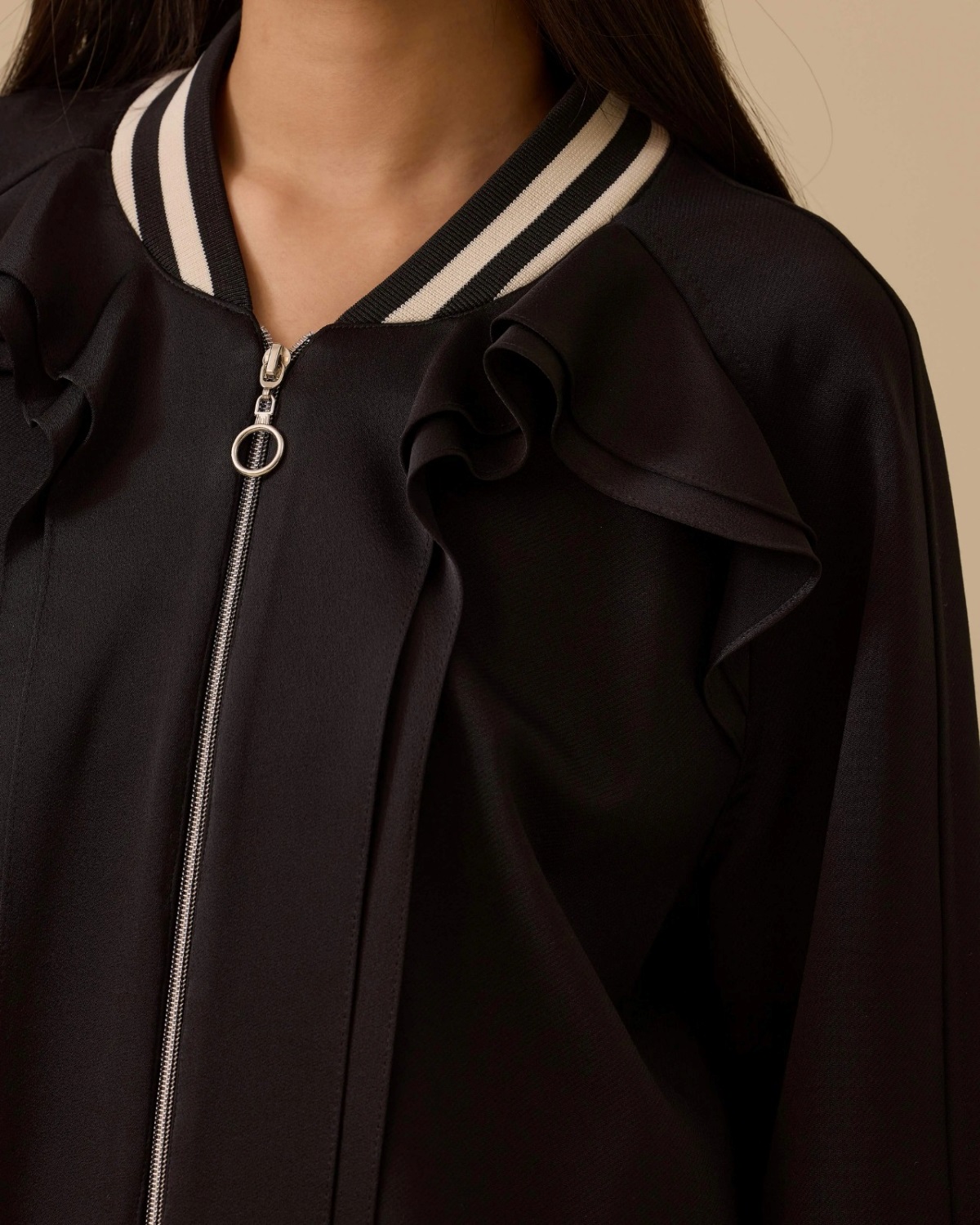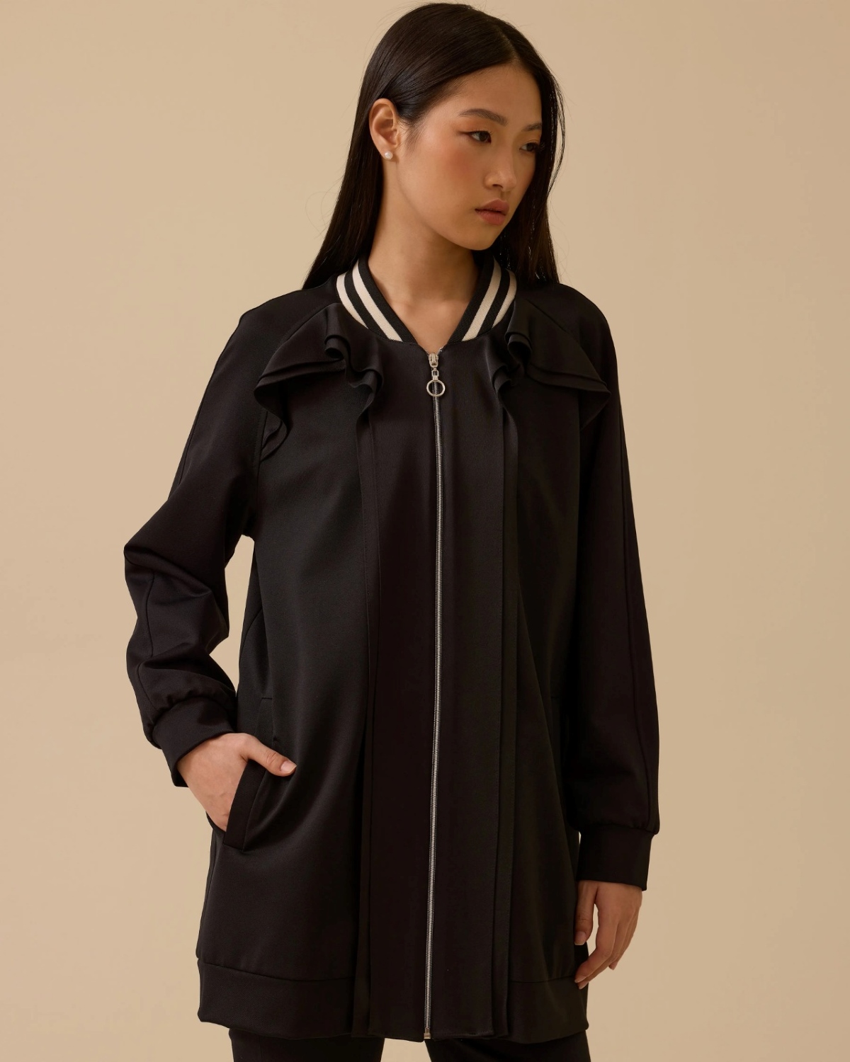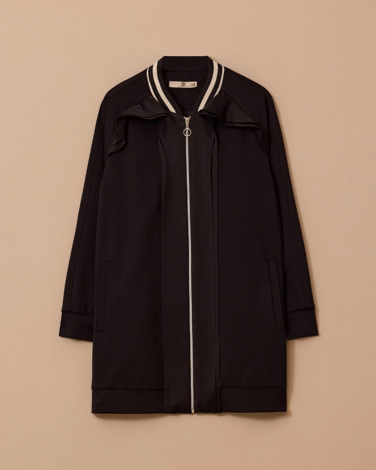 Fırfır Detaylı Fermuarlı Ceket, feminen fırfır detayları ve pratik fermuar tasarımıyla şıklığı günlük stilinle buluşturur.