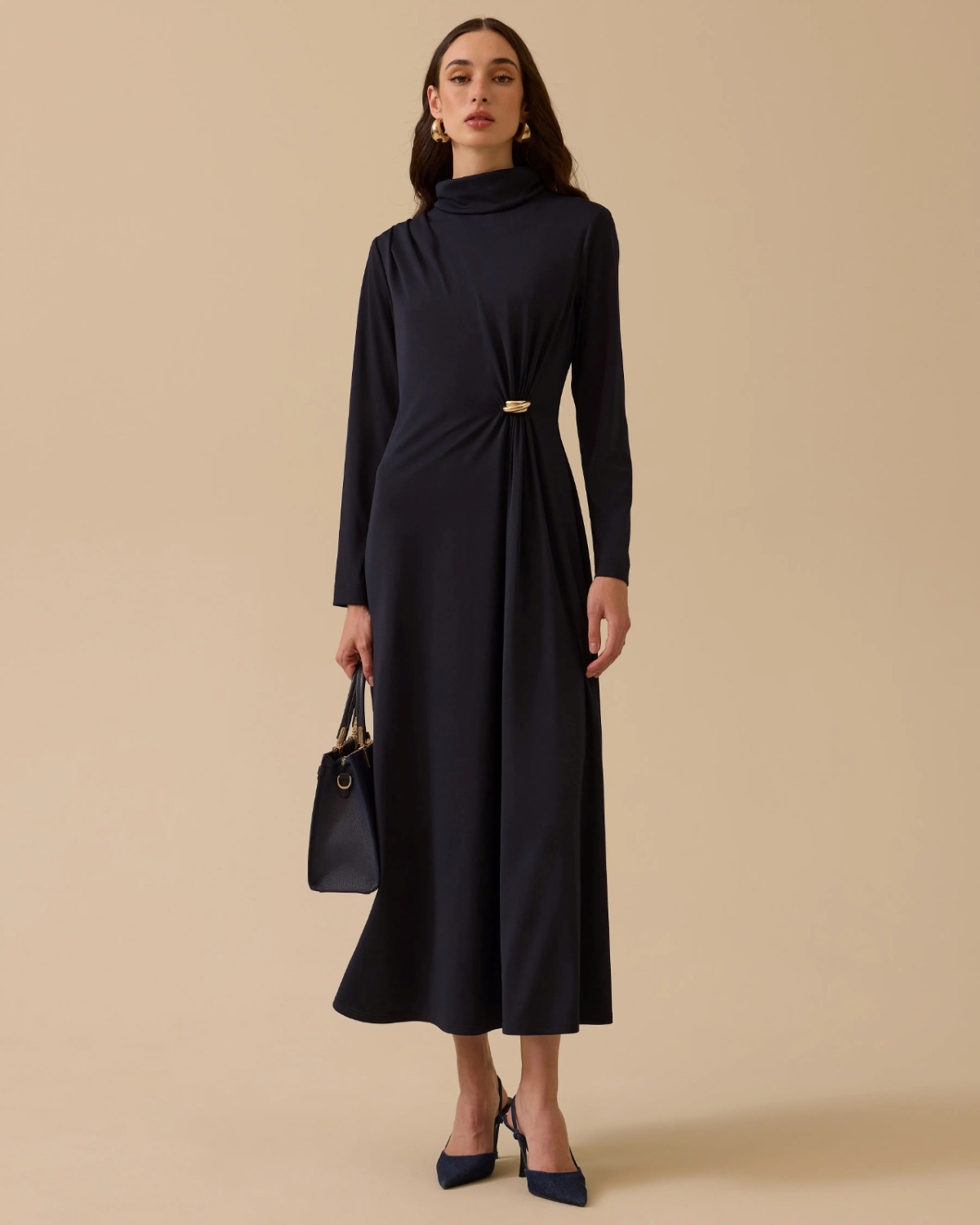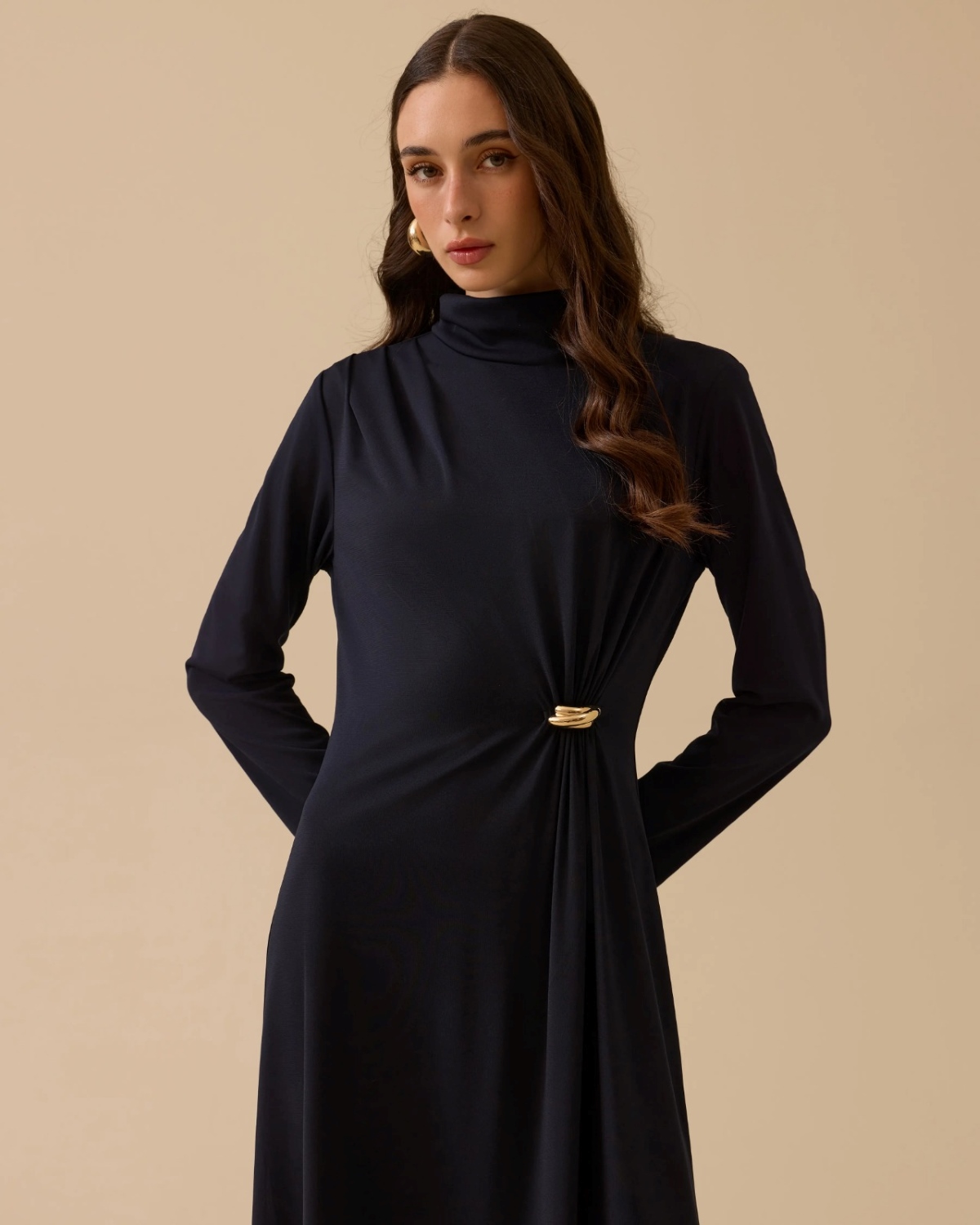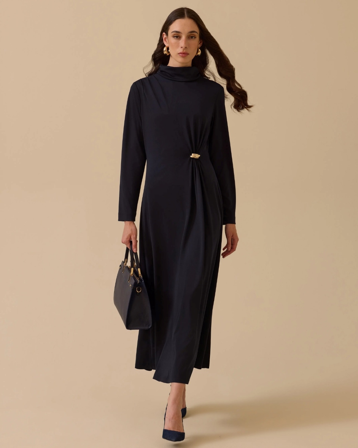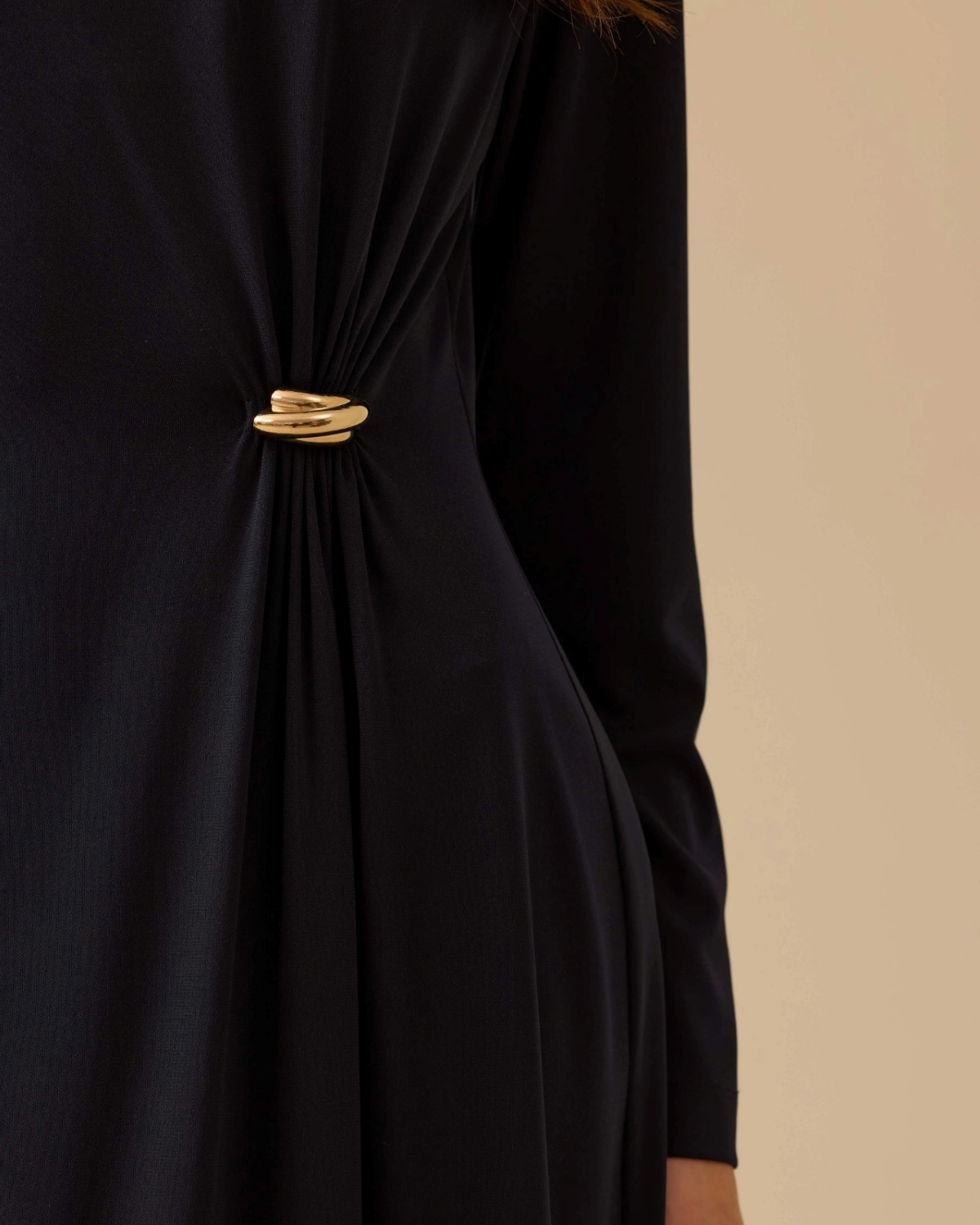 Metal Aksesuarlı Drapeli Elbise, modern drape detayları ve zarif metal aksesuarıyla göz alıcı bir stil sunar.