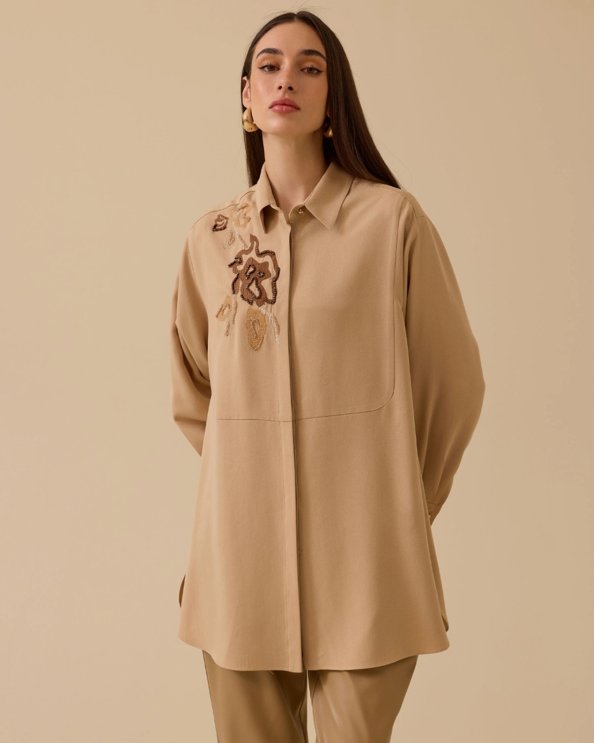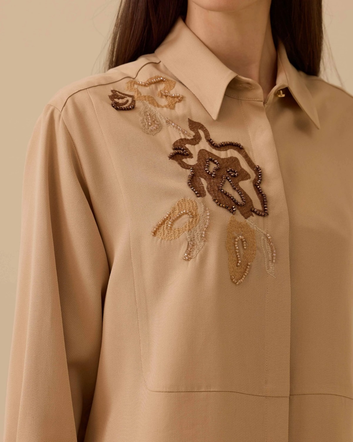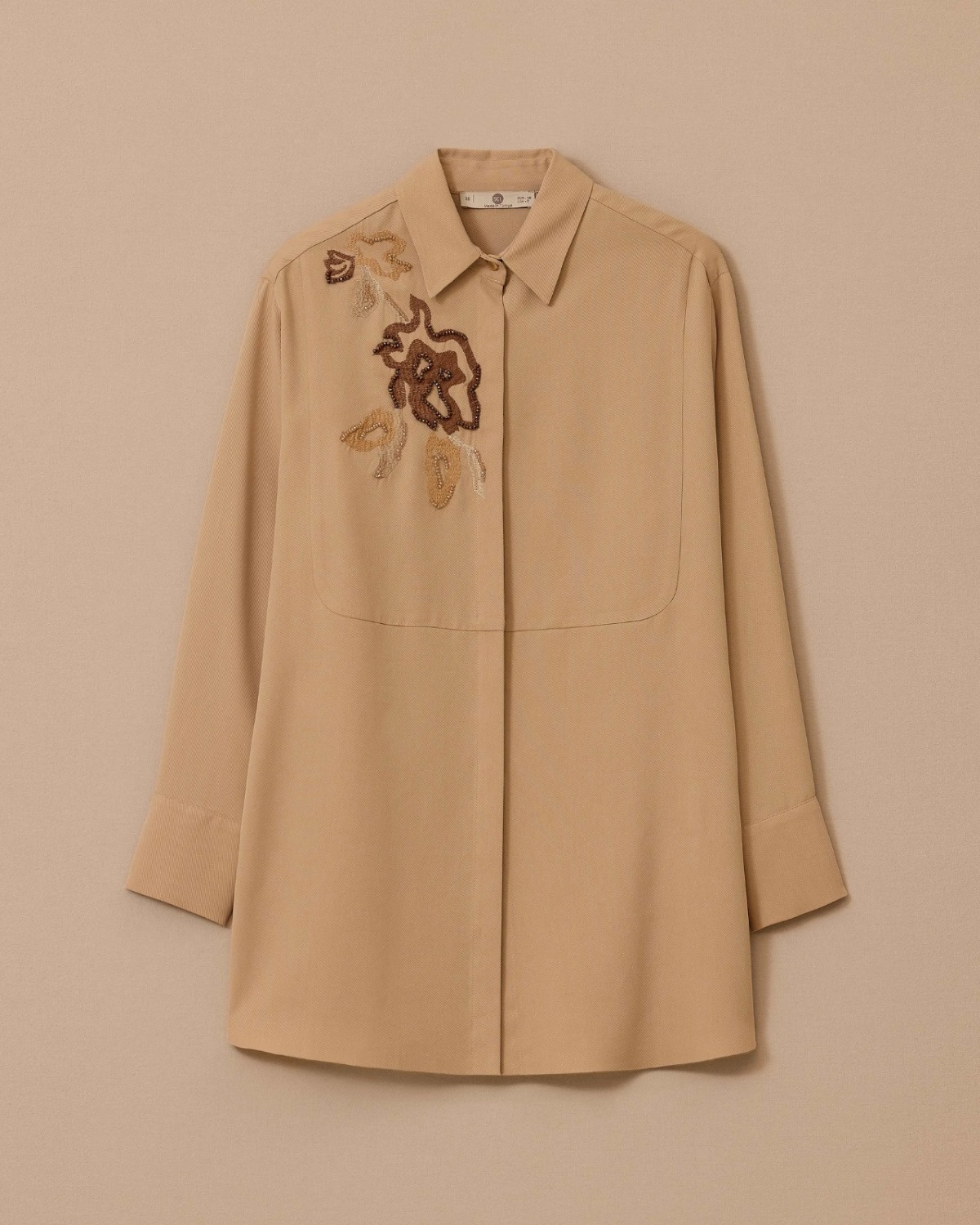 Nakışlı Boncuk Detaylı Gömlek, zarif nakış işlemeleri ve şık boncuk dokunuşlarıyla modern ve elegant bir görünüm sunar.