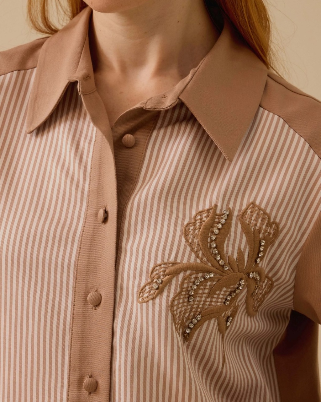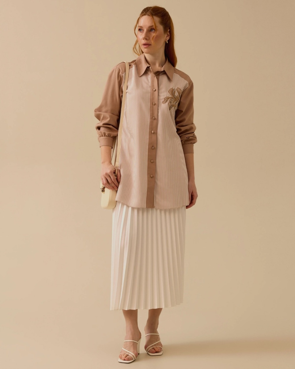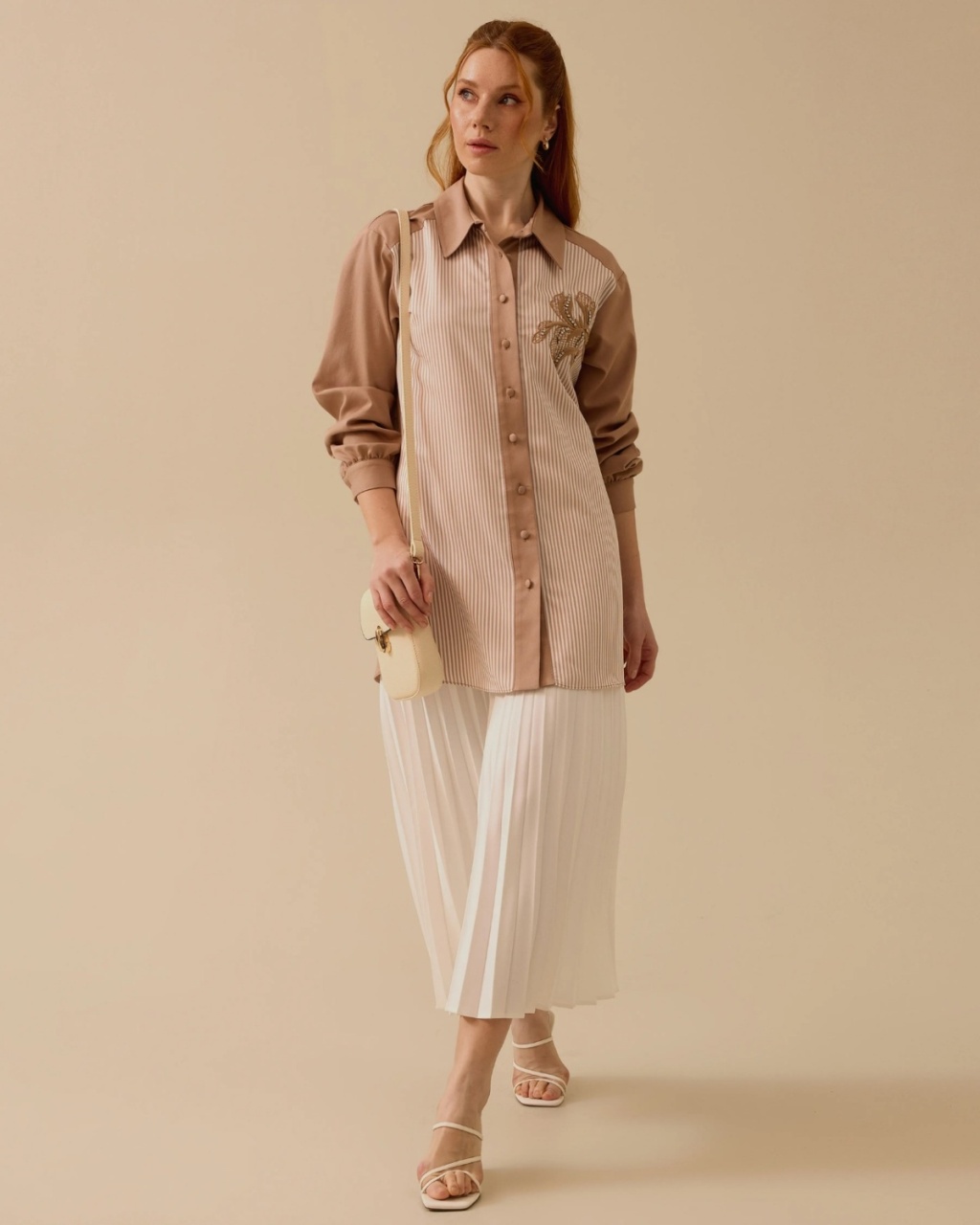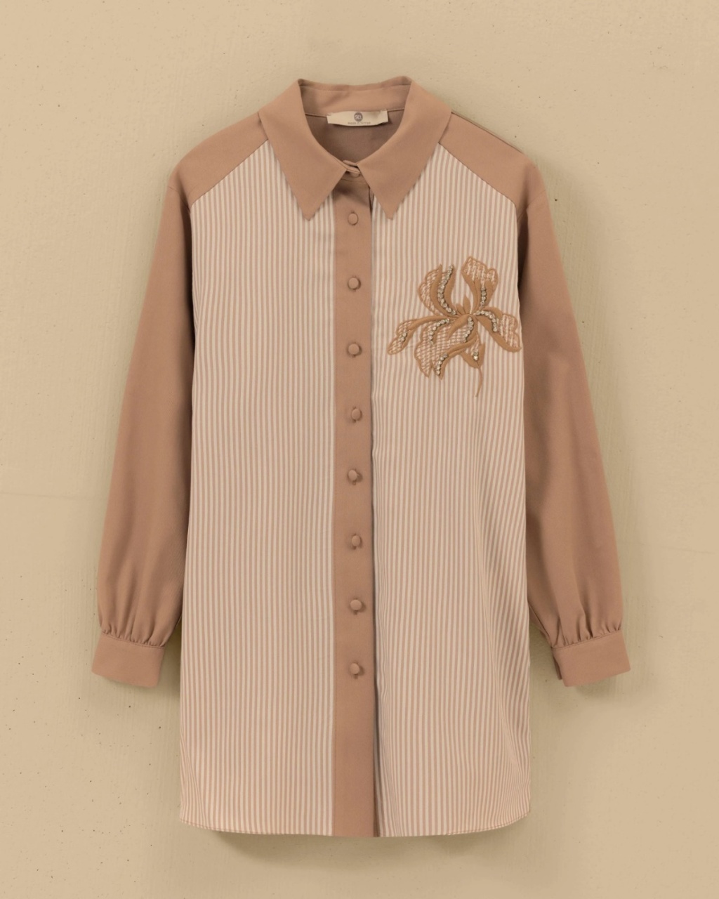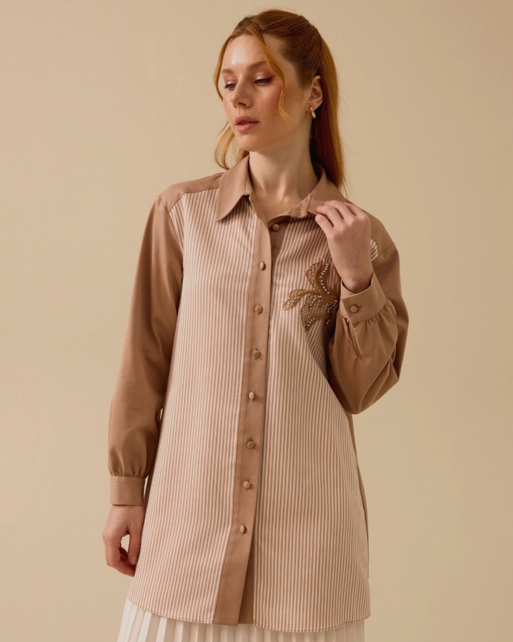 Nakışlı Çizgili Tunik, zarif nakış detayları ve çizgili deseniyle günlük kombinlere hareket katar, modern bir şıklık sunar.