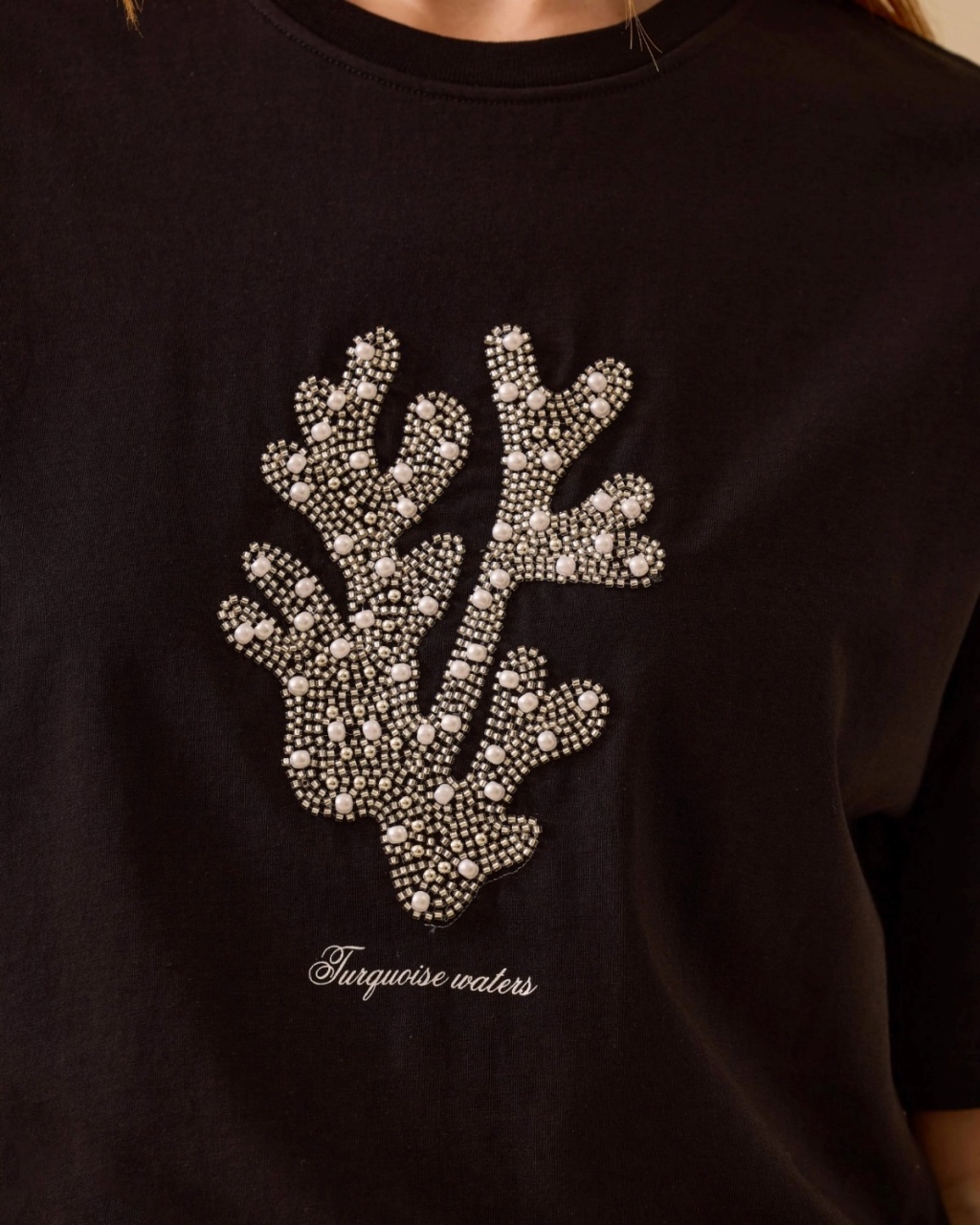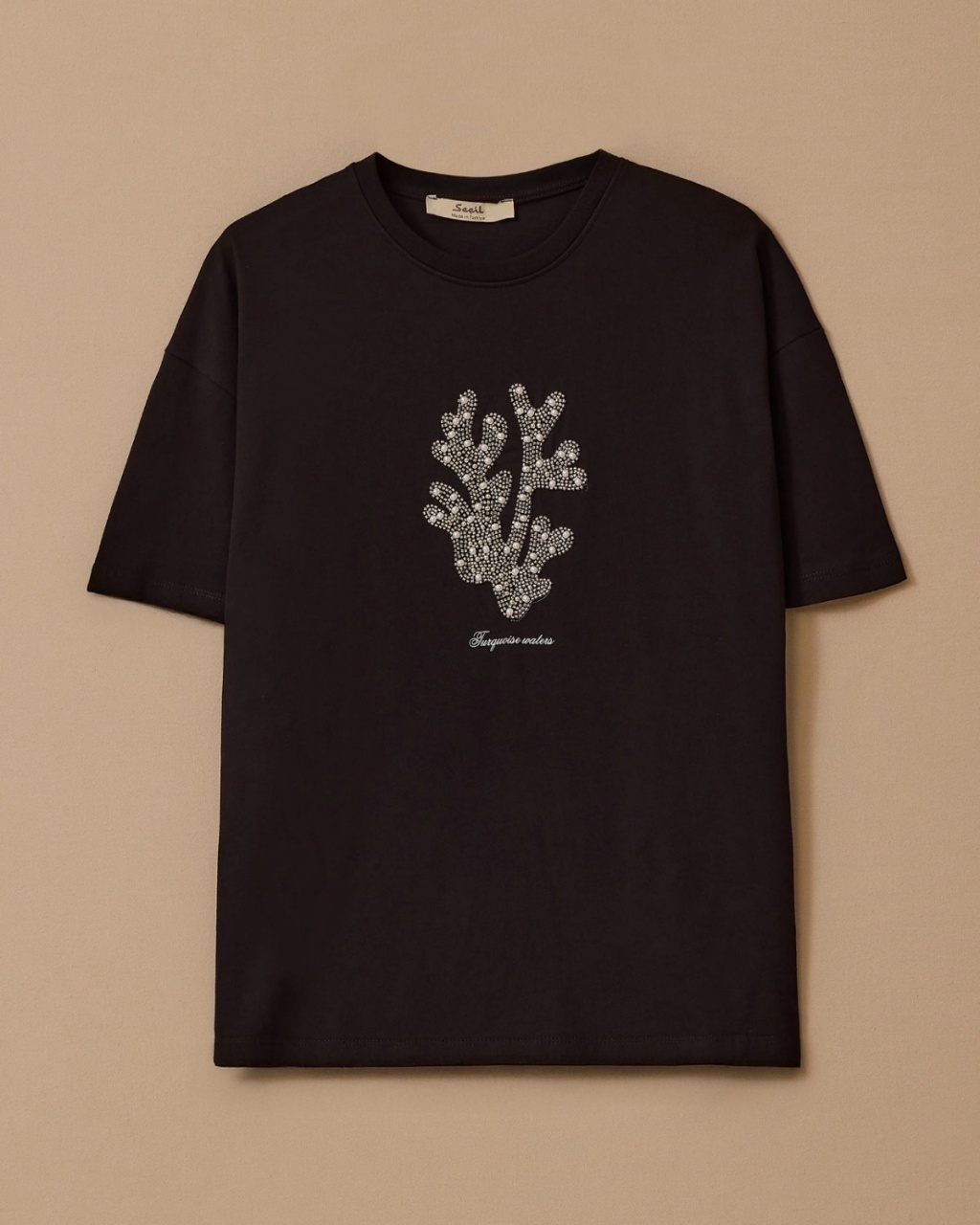 Taş Detaylı Baskılı Tişört, parlak taş süslemeleri ve dikkat çeken yazı baskısıyla günlük kombinlere enerjik bir dokunuş katar.