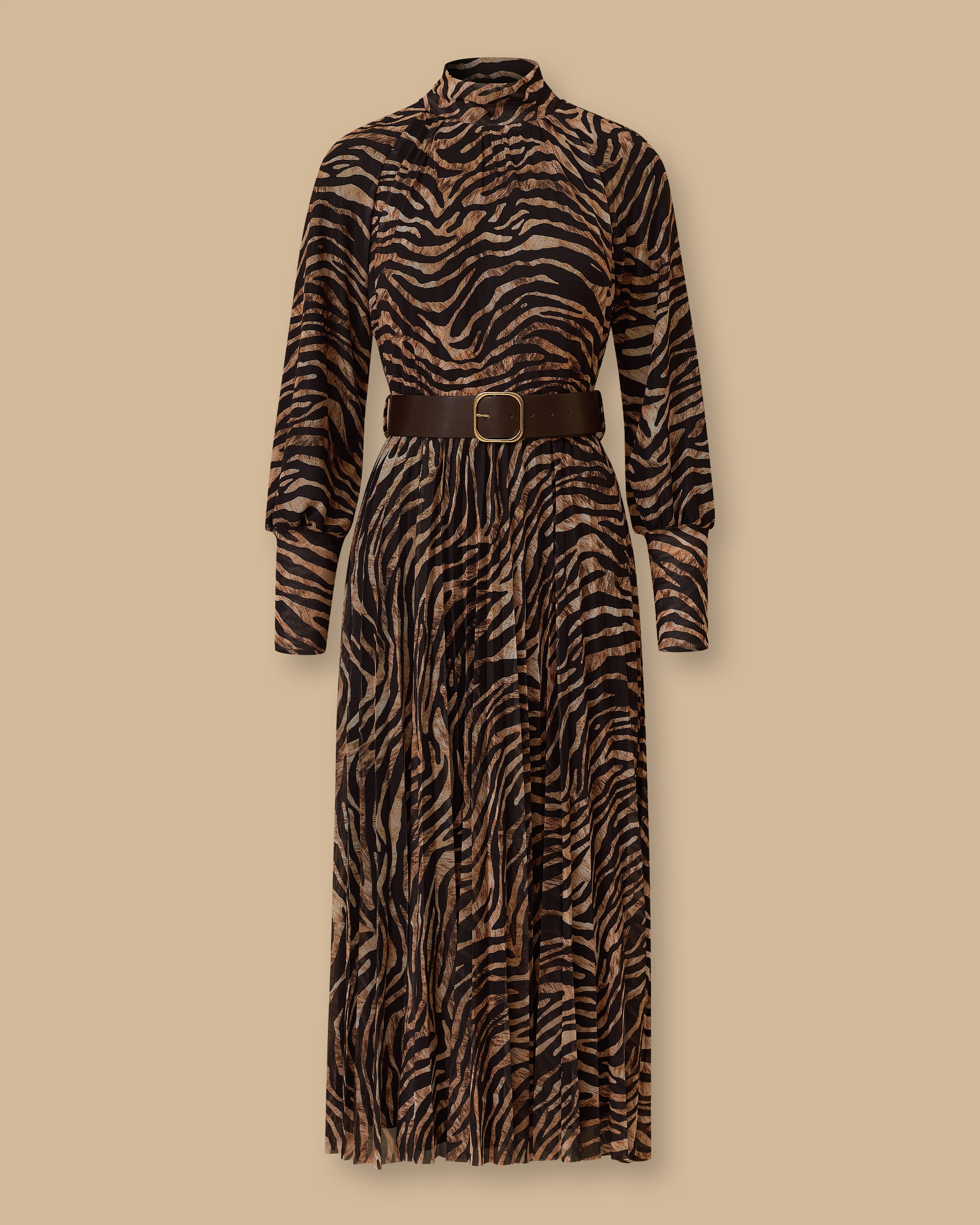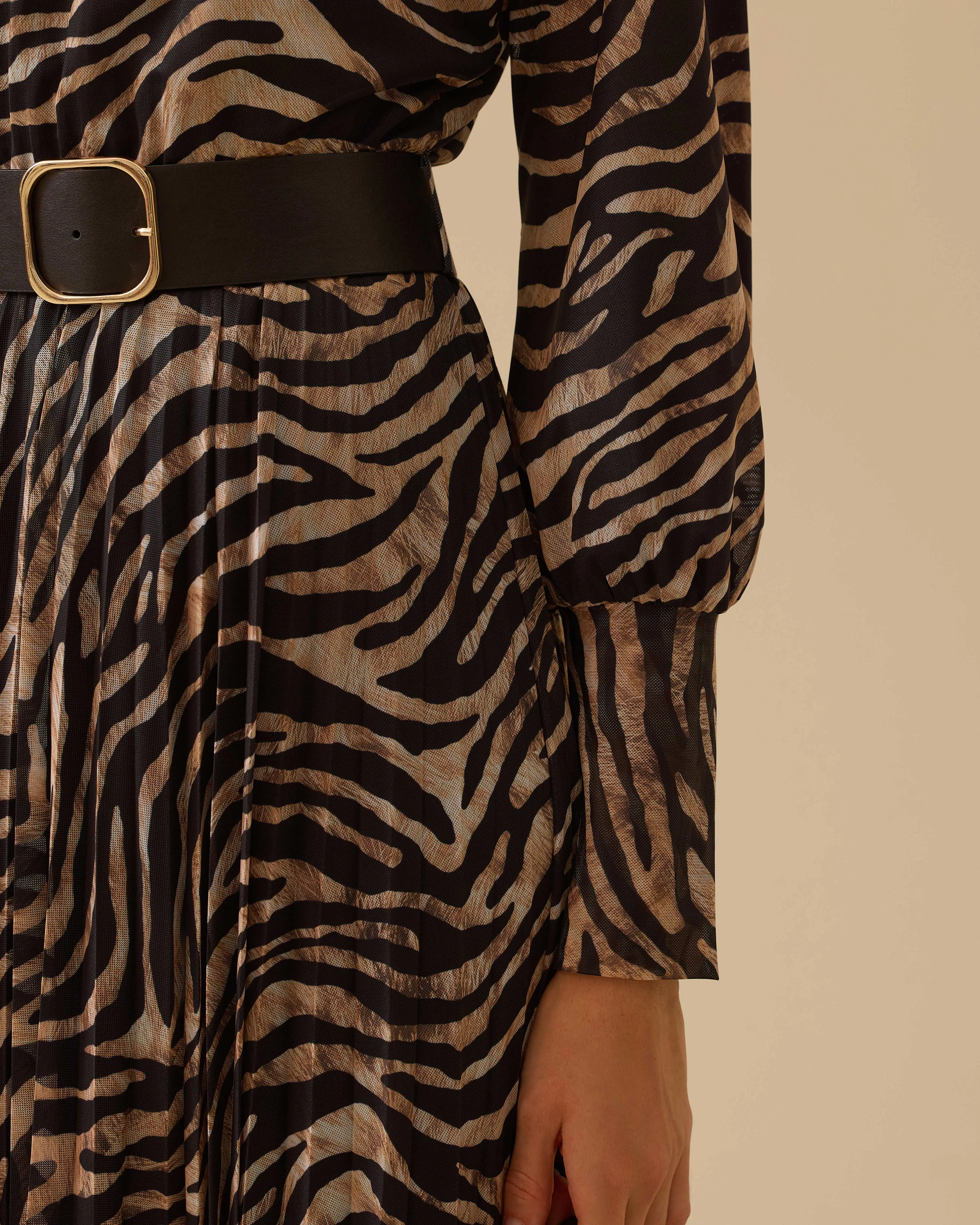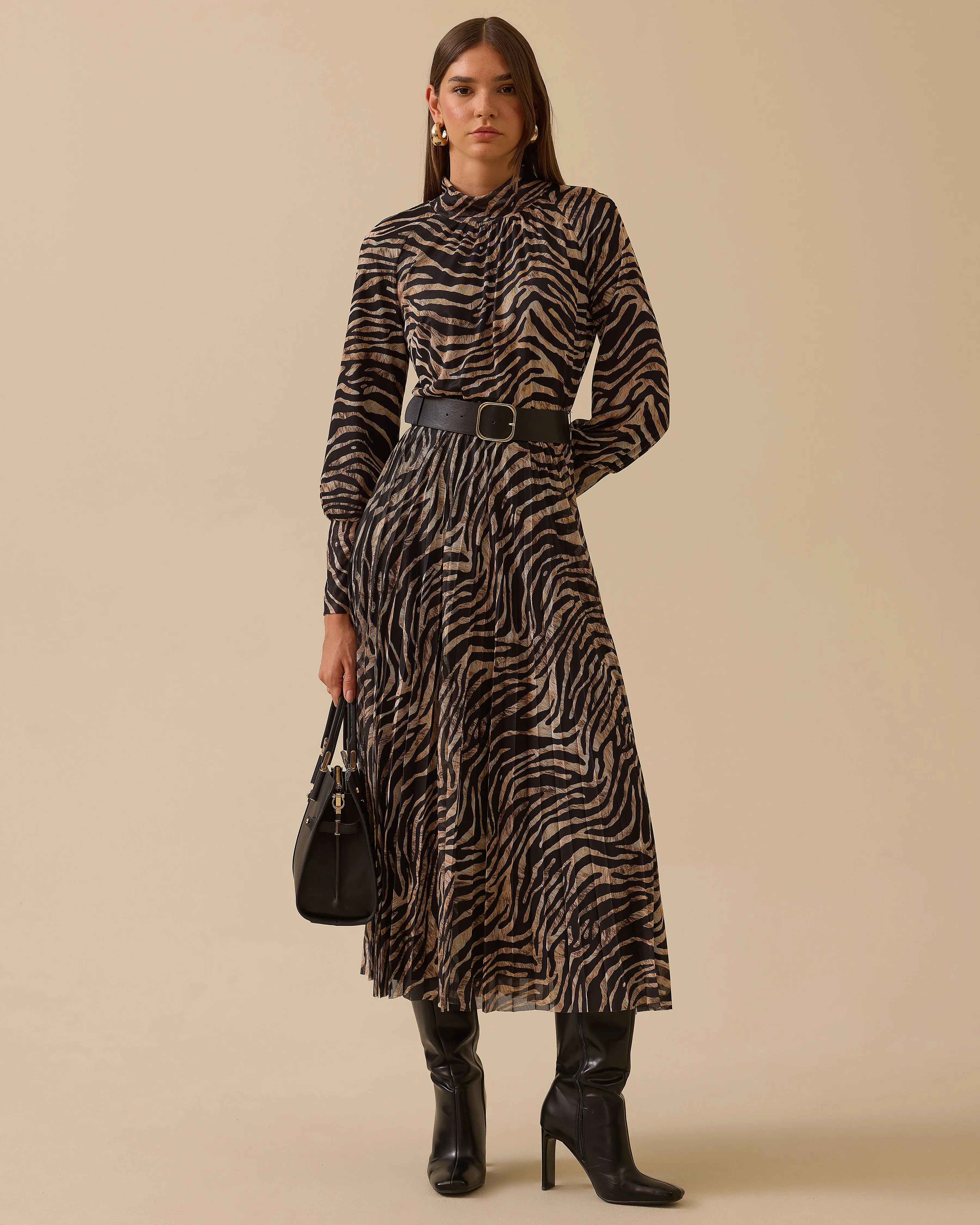 Zebra Desenli Kemerli Elbise, şık tasarımı ve zarif kemeriyle stiline enerji katar.