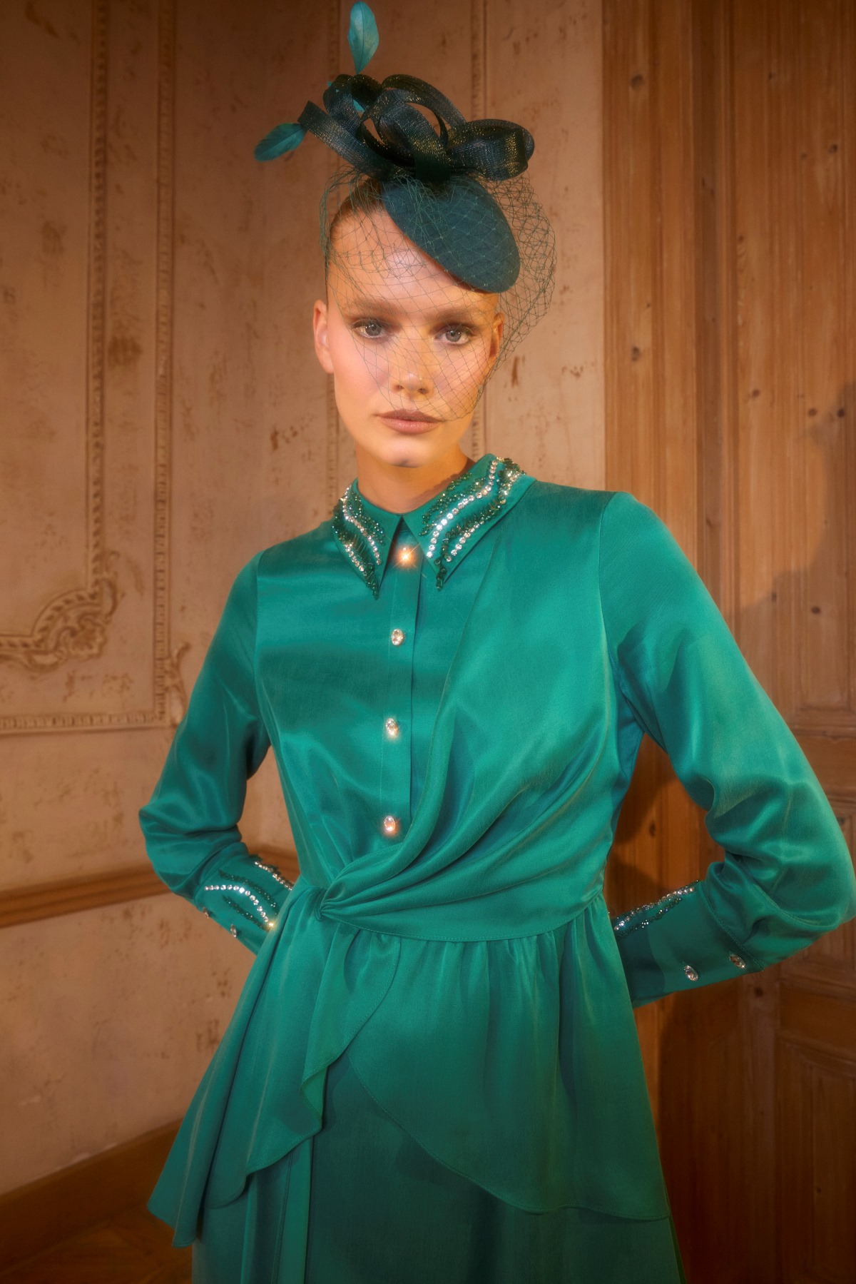 YENİ SEÇİL KADIN desenli boncuk detaylı saten elbise 10002521311005
